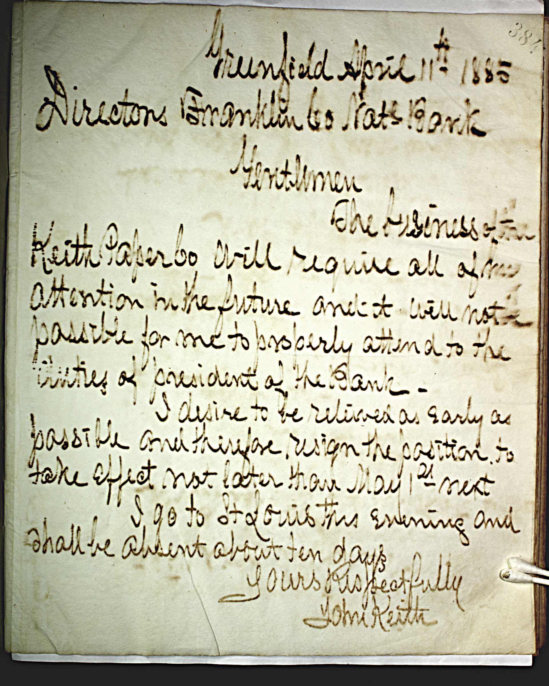 Greenfield April 11th , 85 [1885] -- Directors Franklin Co. Nat -- l -- Bank -- Gentlemen, -- The business of the Keith Paper Co. will require all of my attention in the future and it will not be possible for me to properly attend to the duties of president of the bank. -- I desire to be relieved as early as possible and therefore, resign the position to the take effect not later than May 1 -- st -- next. -- I go to St. Louis this evening and shall be absent about ten days. -- Yours Respectfully -- John Keith -- ; -- Keith Letters Page 383 is unavailable. e.g.