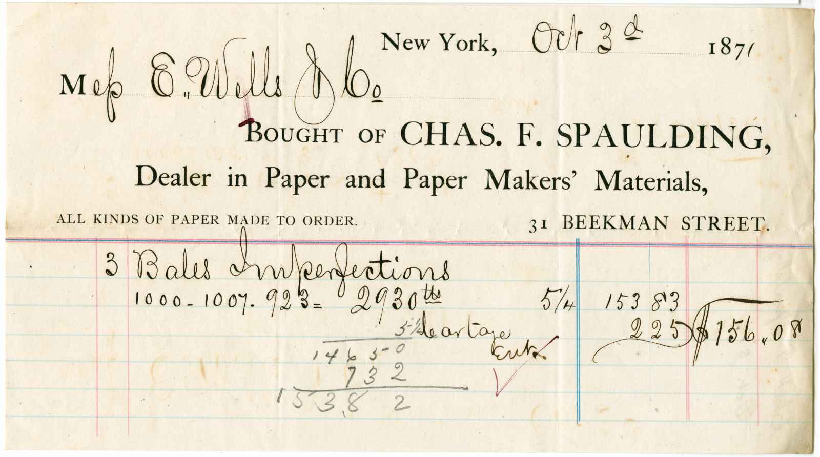 invoice; Spaulding, Charles F. & Co. - Paper & Paper Makers' Materials - N.Y.