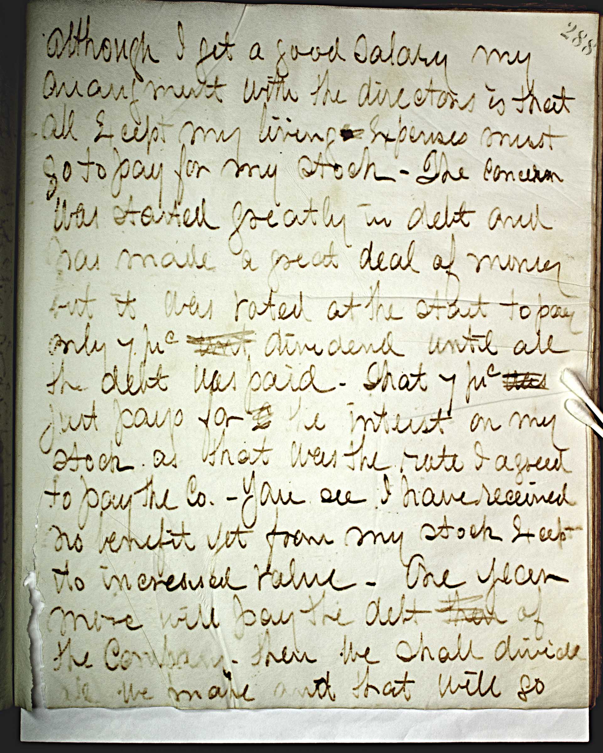 although I get a good salary my arrangement with the directors is that all except my living expenses must go to pay for my stock – the concern was started greatly in debt and has made a great deal of money but it was rated at the start to pay only 7 -- prc -- amt dividend until all the debt was paid. That 7 -- prc -- was just pays for 0 the interest on my stock as that was the rate I agreed to pay the Co. – You see I have received no benefit yet from my stock except to increased value. One year more will pay the debt that of the company-then we shall divide all we made and that will go --