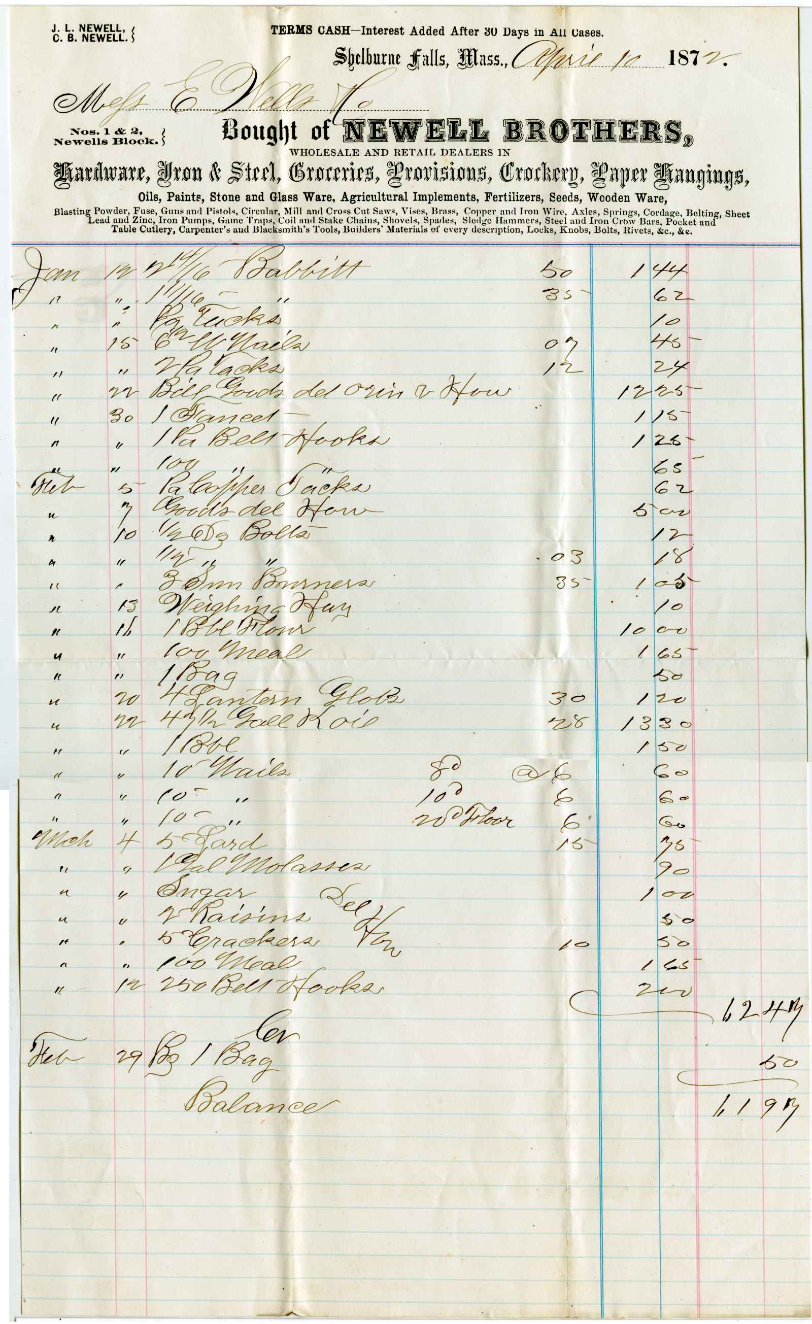 account; Newell Bros. - Hardware - Shelburne Falls, Ma.