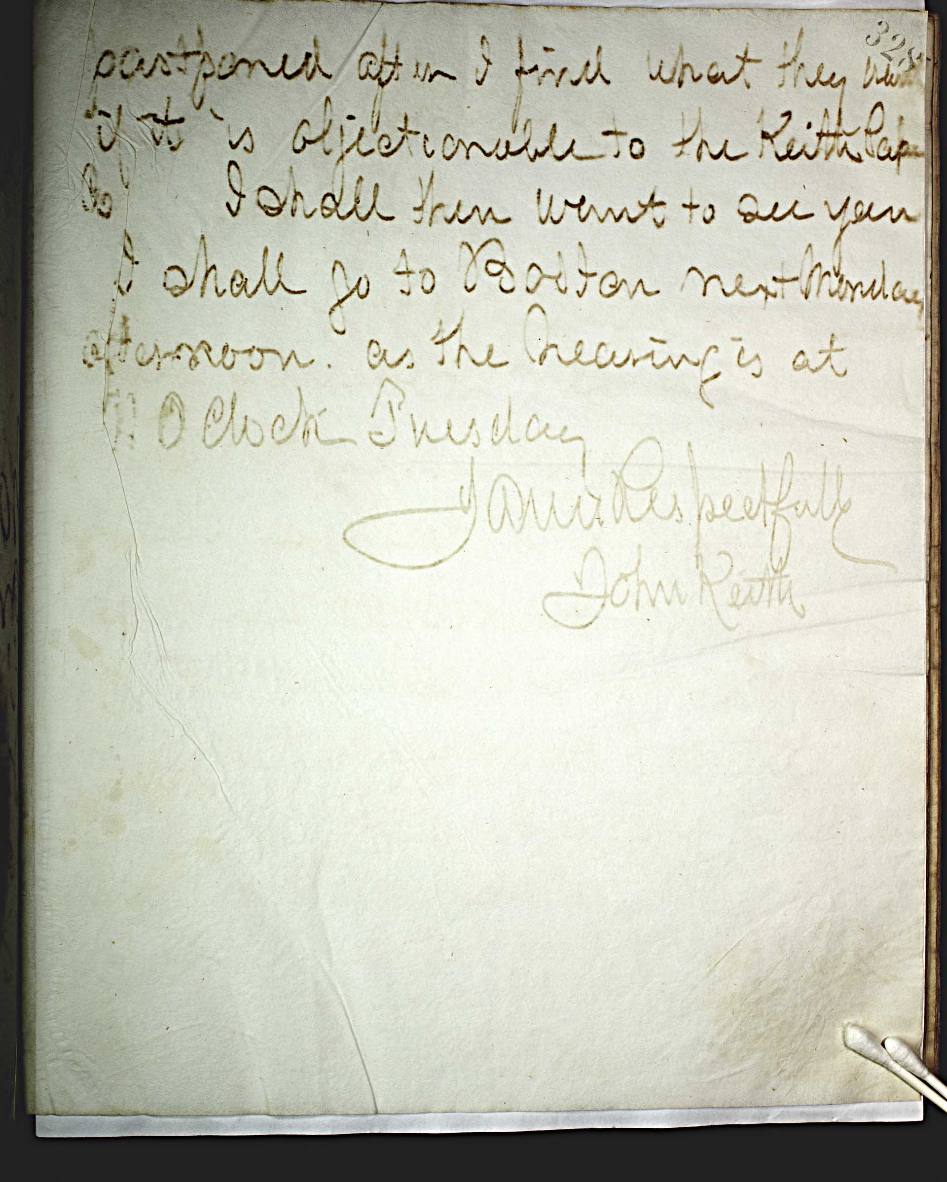 postponed after I find what they [wish] if it is objectionable to the Keith Paper Co. -- I shall go to Boston next Monday afternoon as the hearing is at 11 o'Clock Tuesday. -- Yours Respectfully -- John Keith --