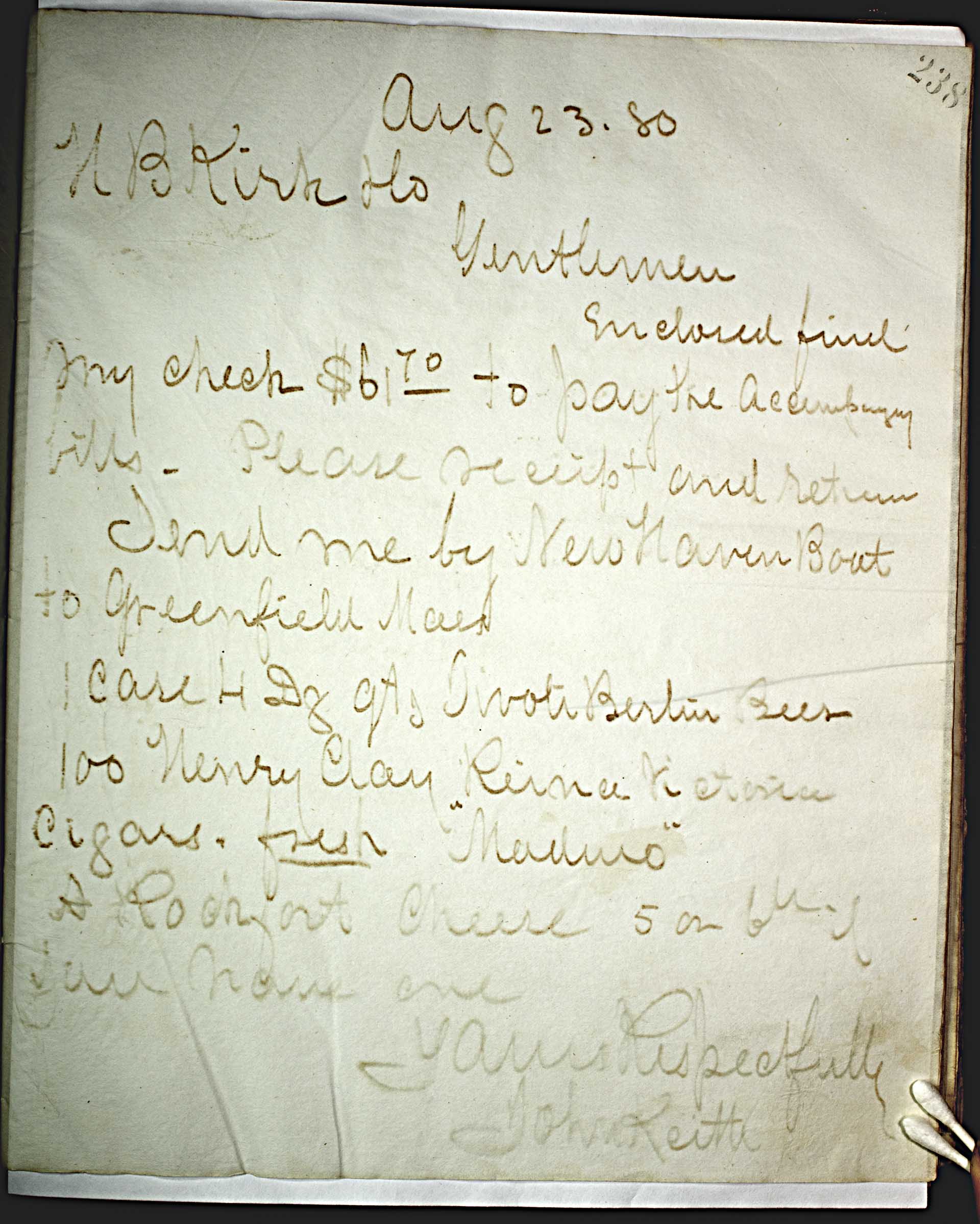Aug 23, 80 [1880] -- N. B. Kirk & Co. -- Gentlemen, -- Endorsed find my check $61 -- 70 -- to pay the accompanying bills. Please receipt and return -- Send me by New Haven Boat to Greenfield Mass. -- 1 case 4 doz. qts. Tivoli Berlin Beer -- 100 Henry Clay Reina Victoria cigars. fresh “Maduro” -- A Roquefort Cheese 5 or 6 lb if you have one -- Yours Respectfully -- John Keith --