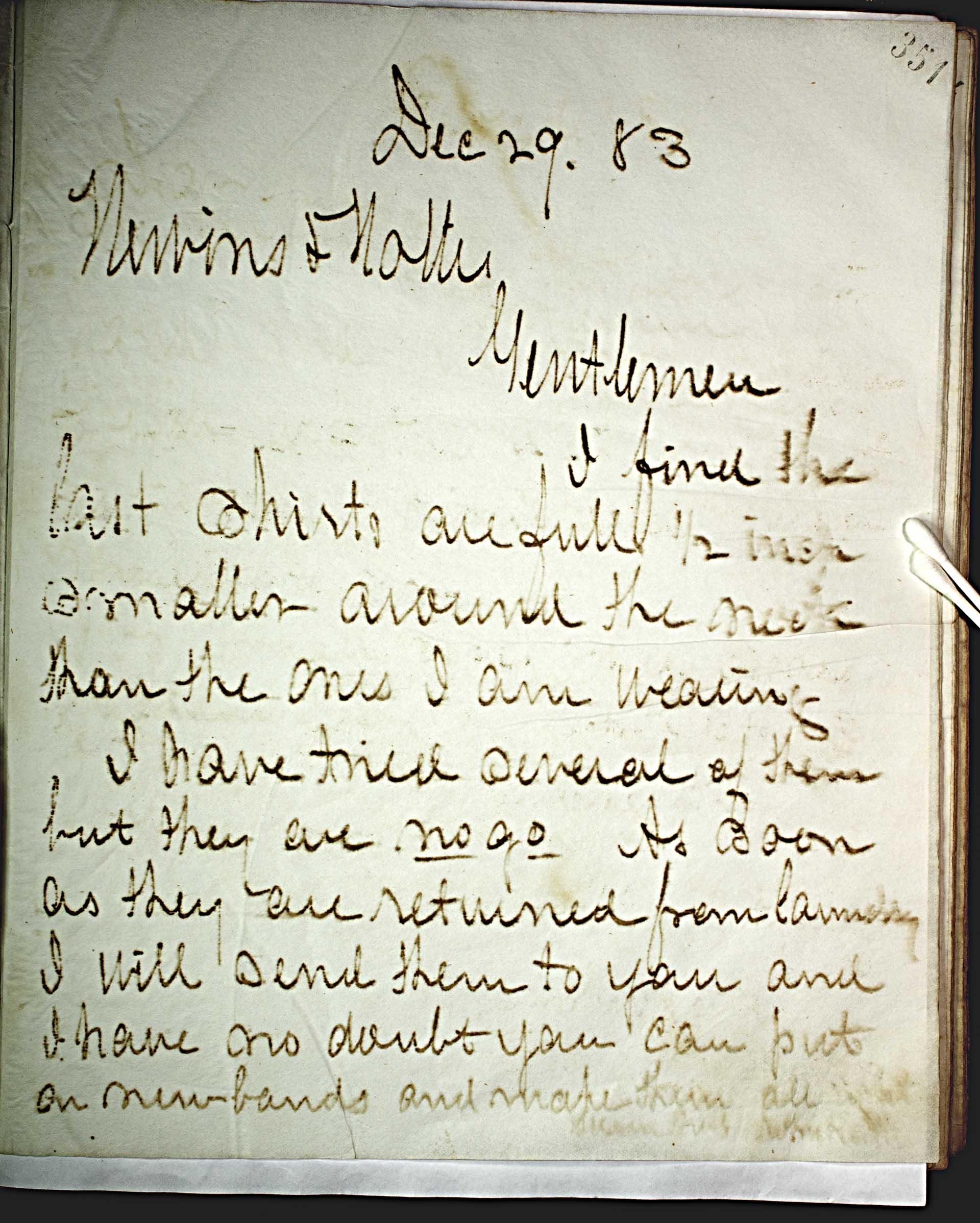 Dec. 29, 83 [1883] -- Nevins & Nolter -- Gentlemen, -- I find the last shirts are full ½ inch smaller around the neck then the ones I am wearing. -- I have tried several of them but they are no go . As soon as they are returned from laundry I will send them to you and I have no doubt you can put on new bands and make them all right. -- Sincerely, John Keith --