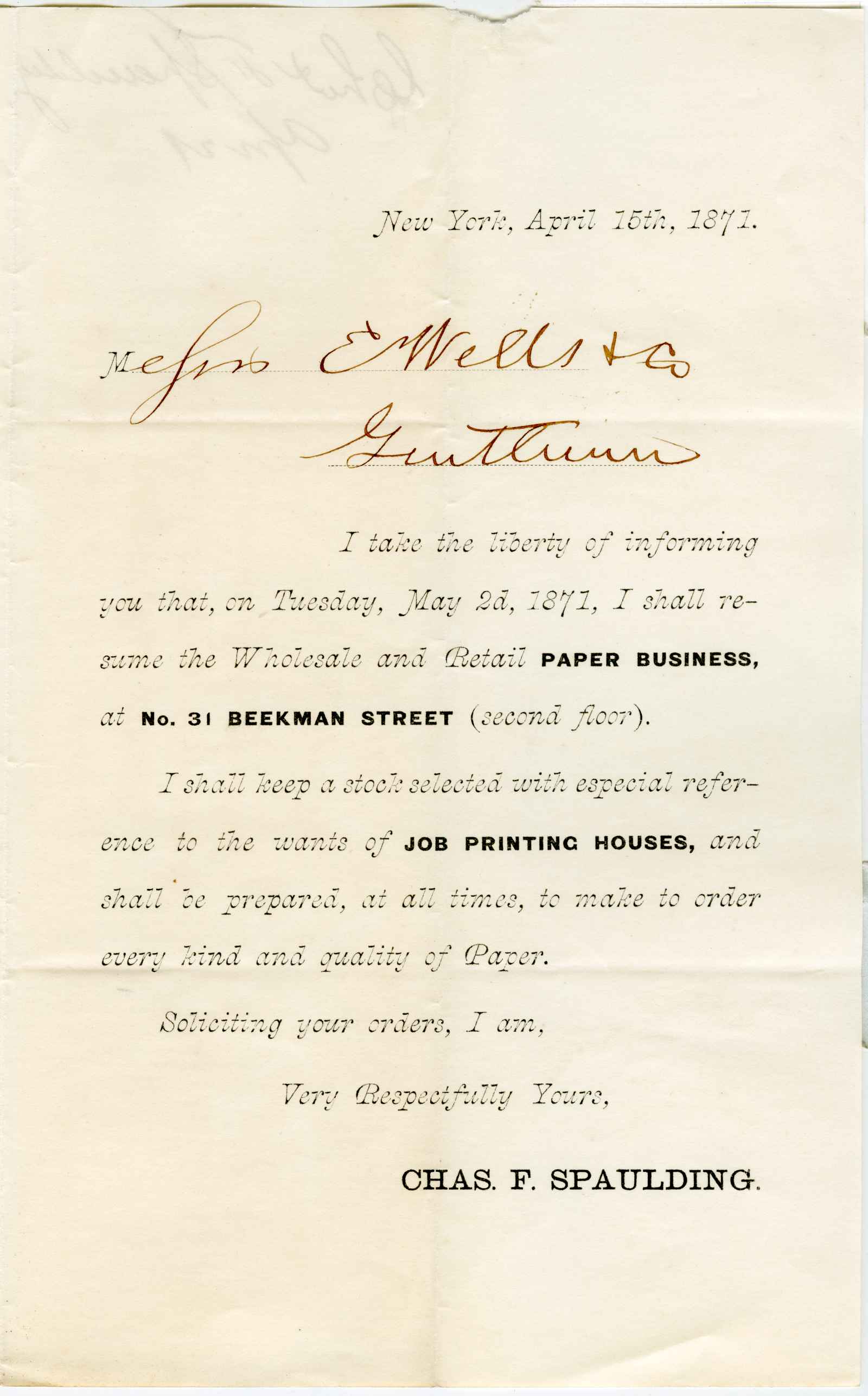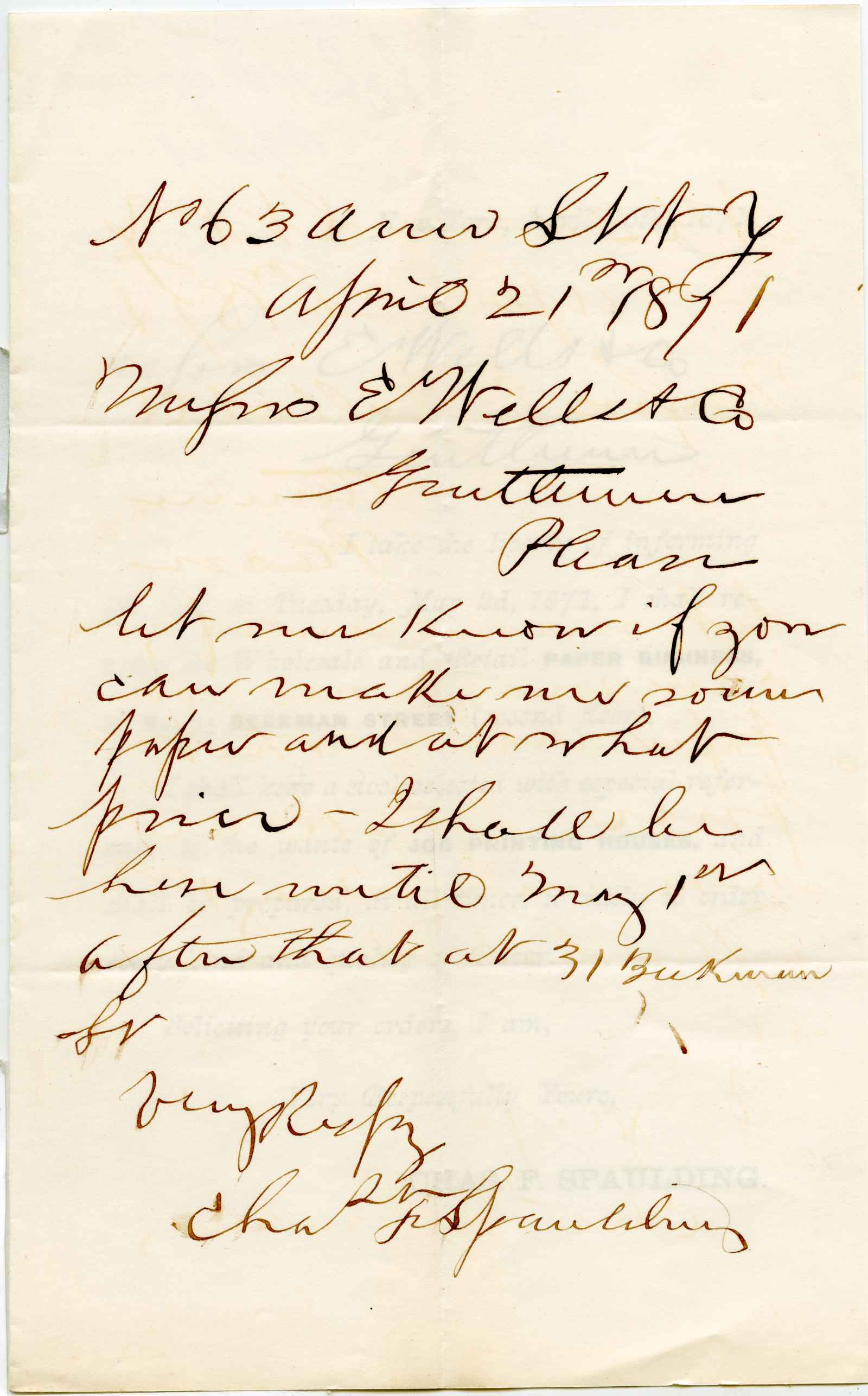 letter; Spaulding, Charles F. & Co. - Paper & Paper Makers' Materials - N.Y.
