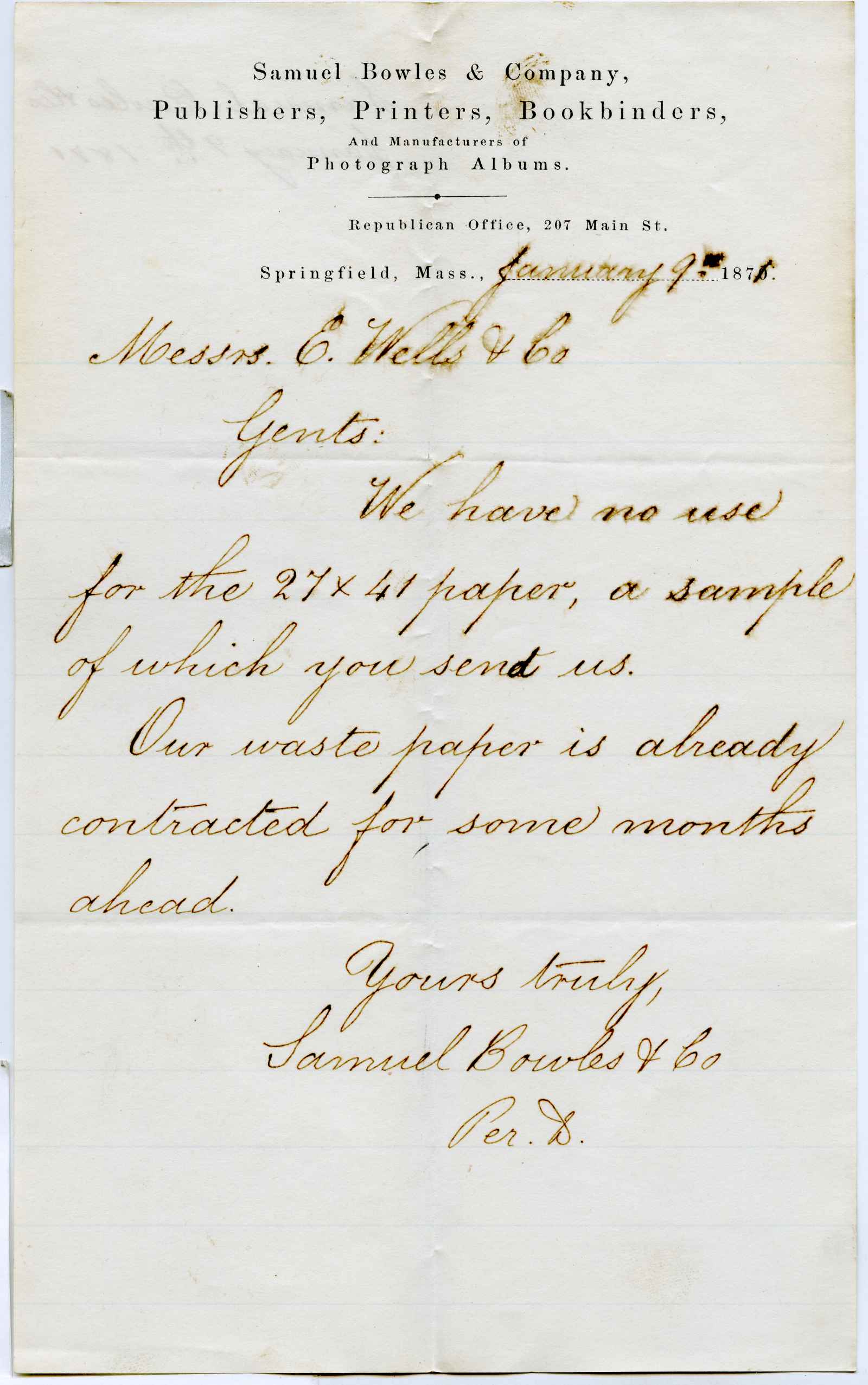 | dc.description | letter; Bowles, Samuel & Co. - Publishers, Printers, Bookbinders - Springfield, Ma. | |