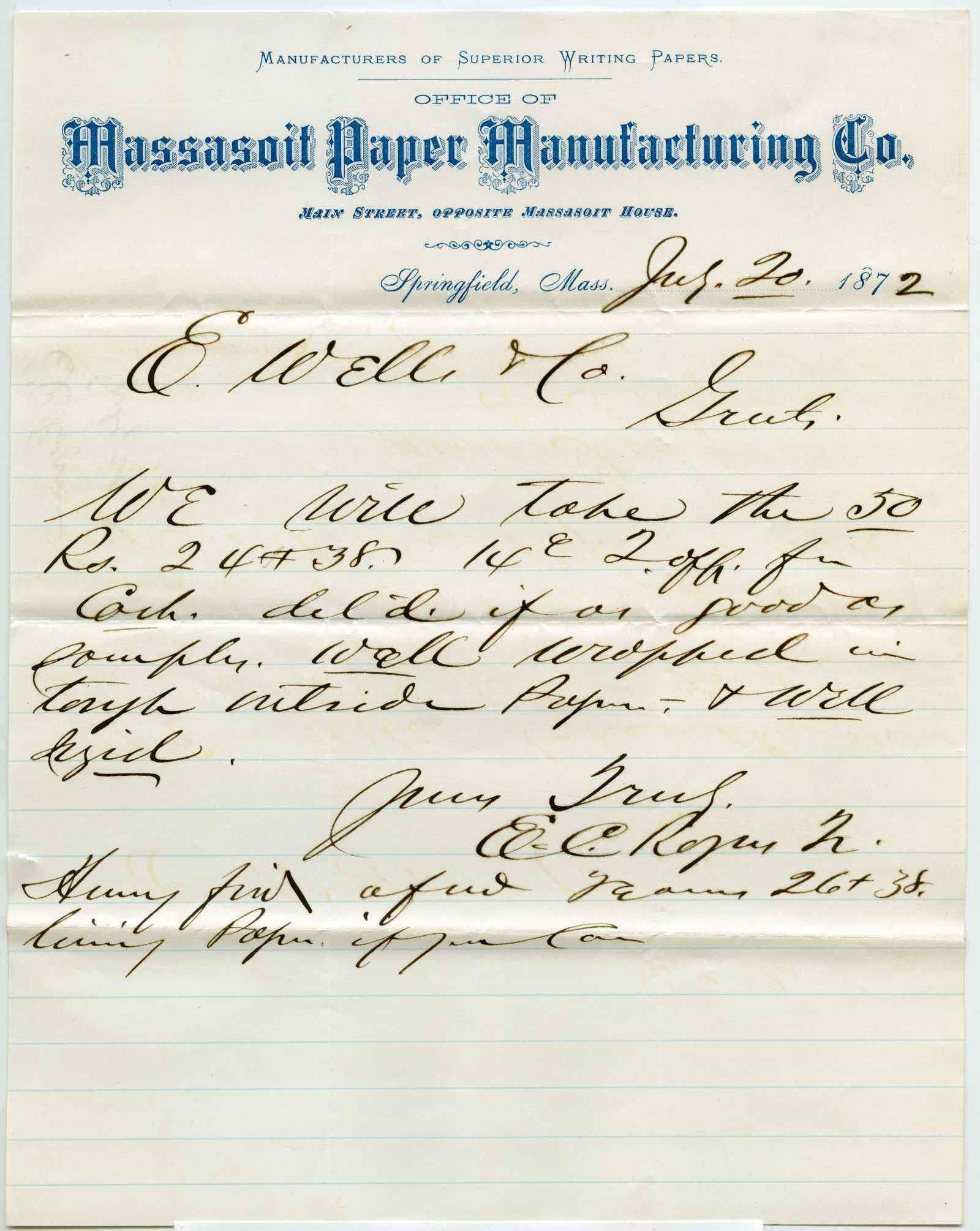 letter; Massasoit Paper Manufacturing Co. - Order for paper - Springfield, Ma.