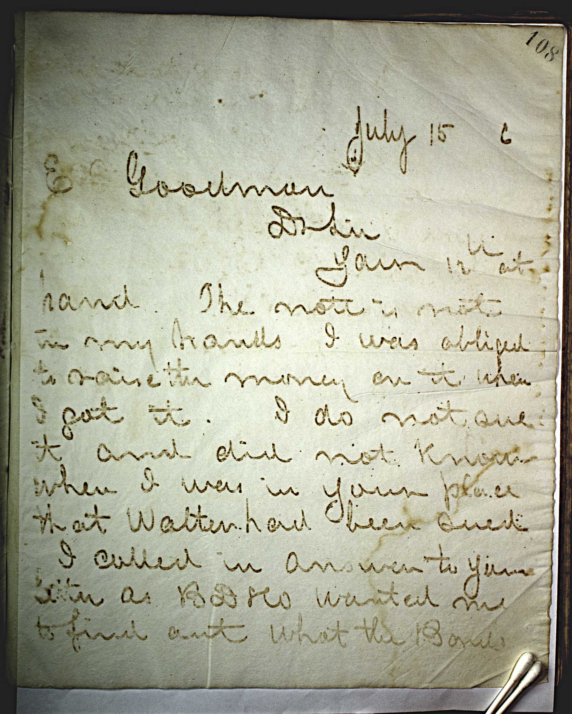 July 15 6 [1876] -- E. Goodman -- Dear Sir, -- Your 12th at hand. The note is not in my hands I was obliged to raise the money on it when I got it. I do not owe it and did not know when I was in your place that Walter had been sued. -- I called in answer to your letter as BD & Co. wanted me to find out what the Bonds --