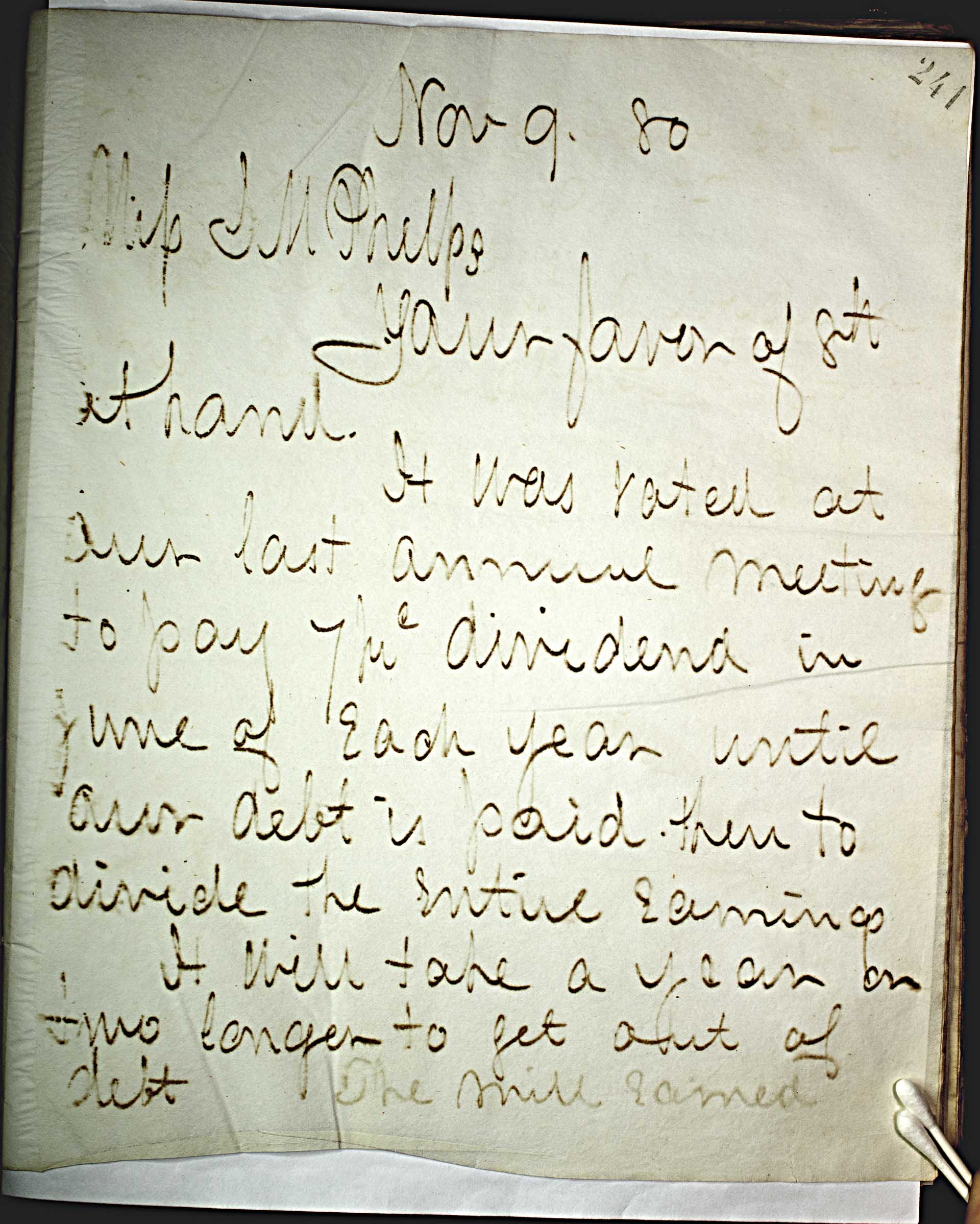 Nov 9, 80 [1880] -- [Mr.] S.M. Phelps -- Your favor of 8th at hand. -- It was voted at our last annual meeting to pay 7 -- prc -- dividend in June of each year until our debt is paid then to divide the entire earnings. -- It will take a year or two longer to get out of debt. The mill earned --