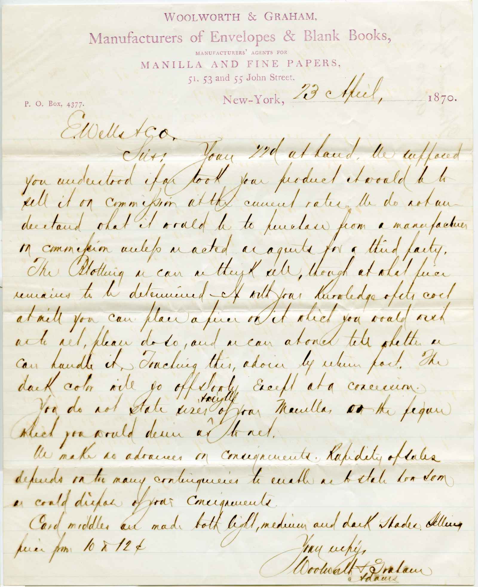letter; Woolworth & Graham - Manufacturers of Envelopes and Blank Books - N.Y.
