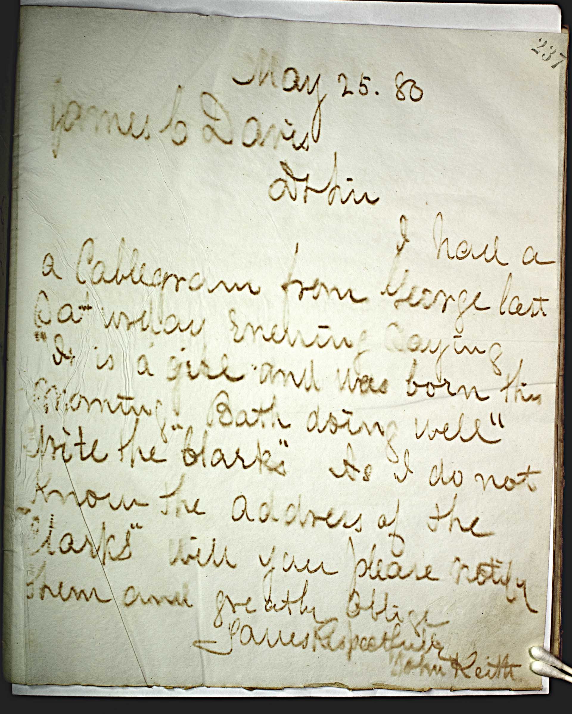 May 25, 80 [1880] -- James C. Davis -- Dr Sir, -- I had a cablegram from George last Saturday evening saying “It is a girl and was born this morning both doing well” write the “Clarks” I do not know the addresses of the “Clarks” will you please notify them and greatly oblige. -- Yours Respectfully -- John Keith --