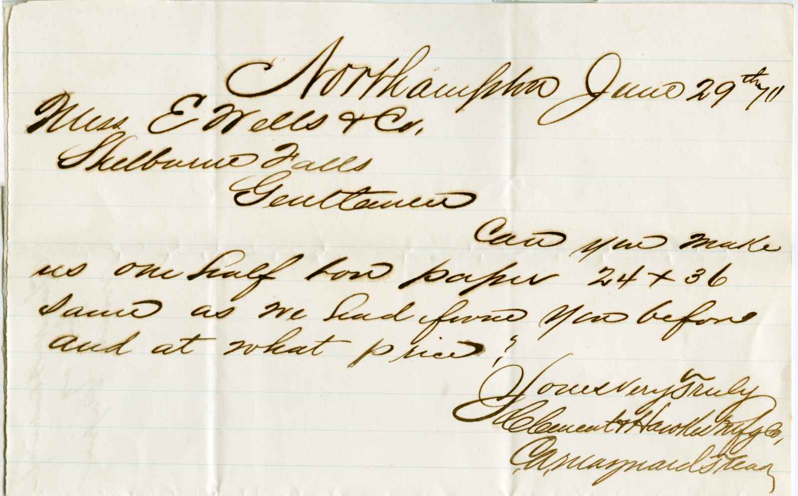 letter; Clement & Hawkes Mfg. Co. - Request for specialty papers - Northampton, Ma.