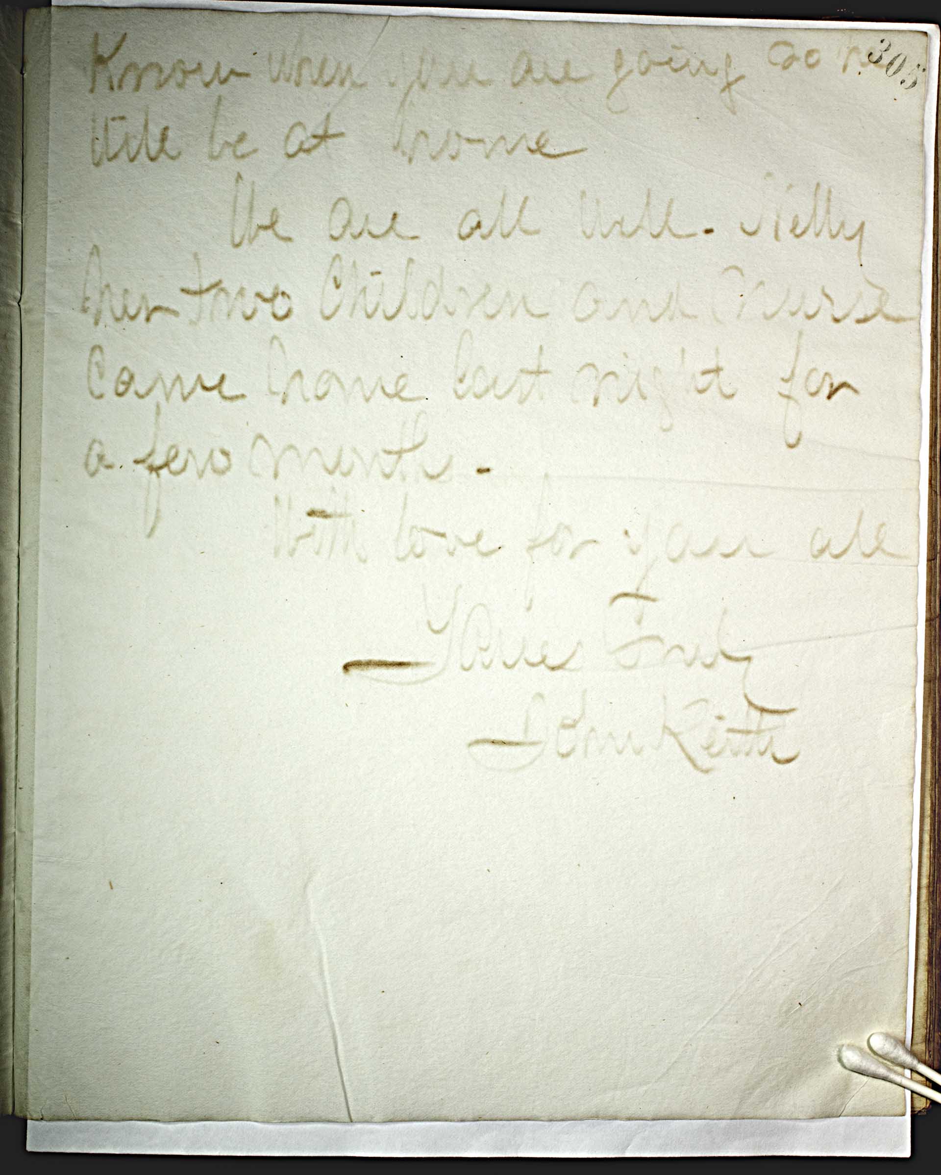 know when you are going to go he will be at home. -- We are all well. Nelly her two children and nurse came home last night for a few months. -- With love for you all, -- Yours Truly -- John Keith --
