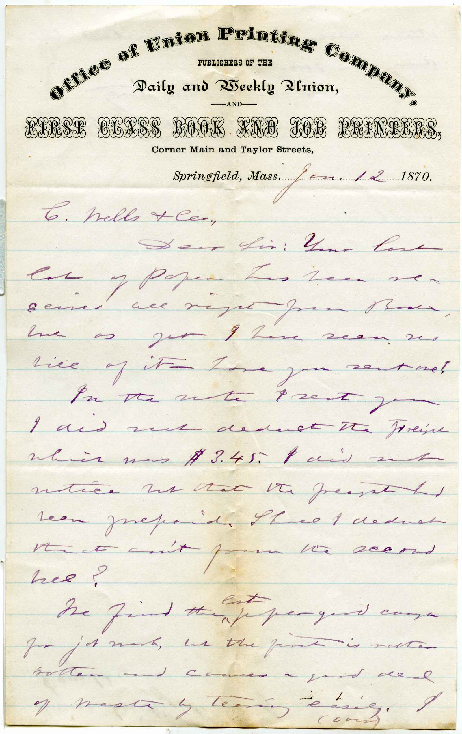 incoming correspondence to the papermaking company of Elisha Wells - circa 1870