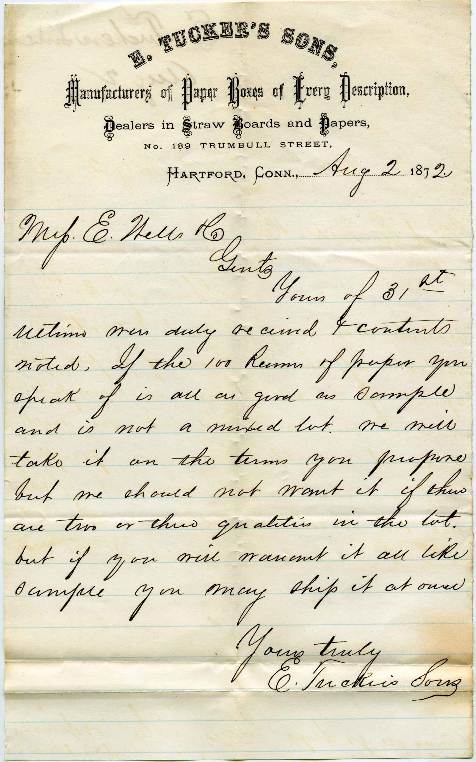 letter; Tucker, E. & Sons - Manufacturers of Paper Boxes - Hartford, Ct.