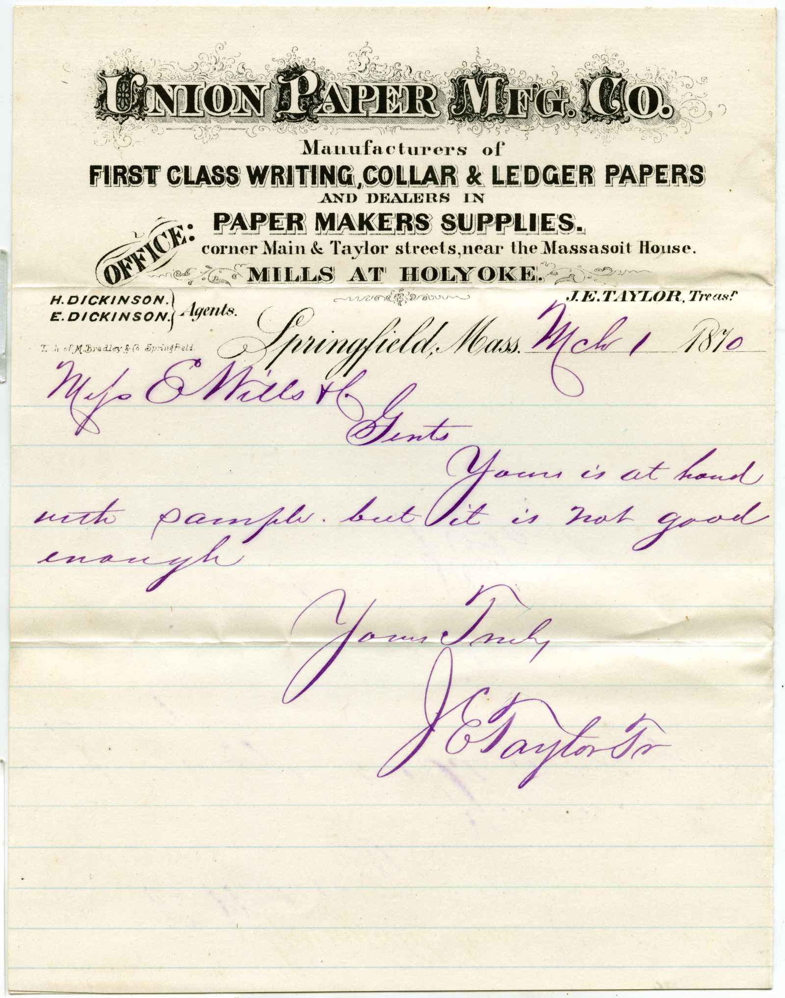 letter; Union Paper Company - Writing Papers - Springfield, Ma.