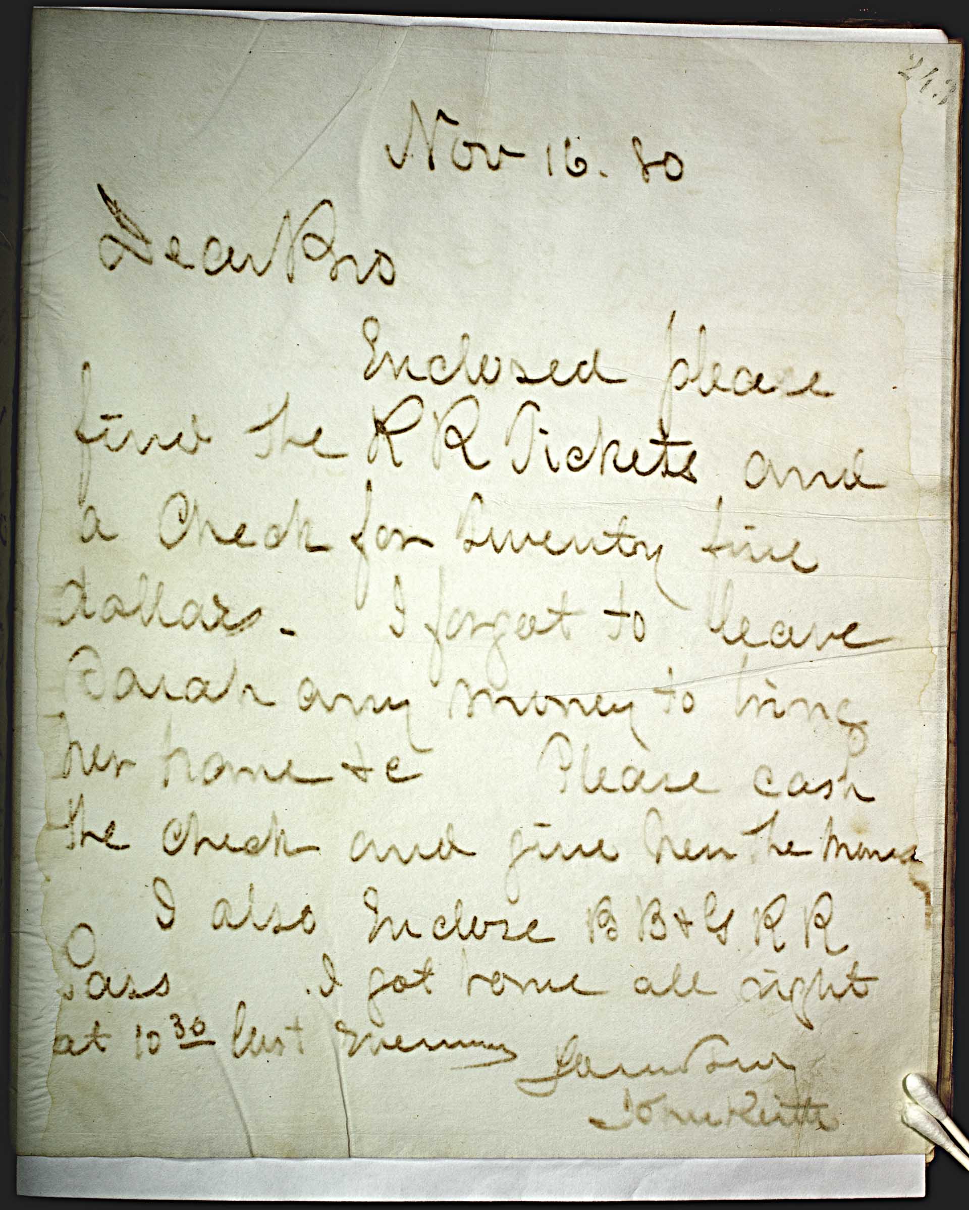 Nov 16, 80 [1880] -- Dear Bro. -- Enclosed please find the RR Tickets and a check for twenty five dollars. I forgot to leave Sarah any money to bring her home &c Please cash the check and give her the money. -- I also enclose BB & G RR pass I got home all right at 10 -- 30 -- last evening. -- Yours Truly -- John Keith --  ; -- BB & G RR . . .  -- Boston, Barre and Gardner Railroad   e.g.