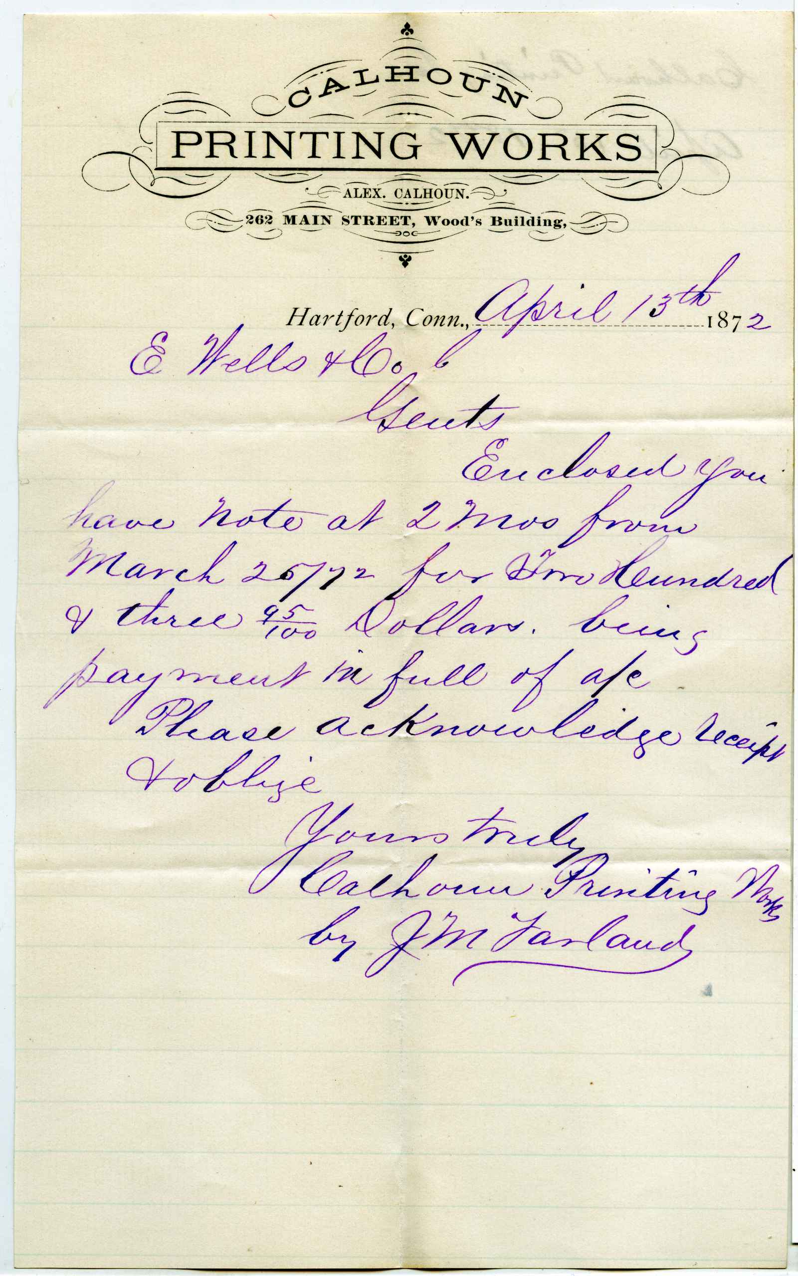 | dc.description | letter; Calhoun Printing Works - Letter of payment - Hartford, Ct. | |