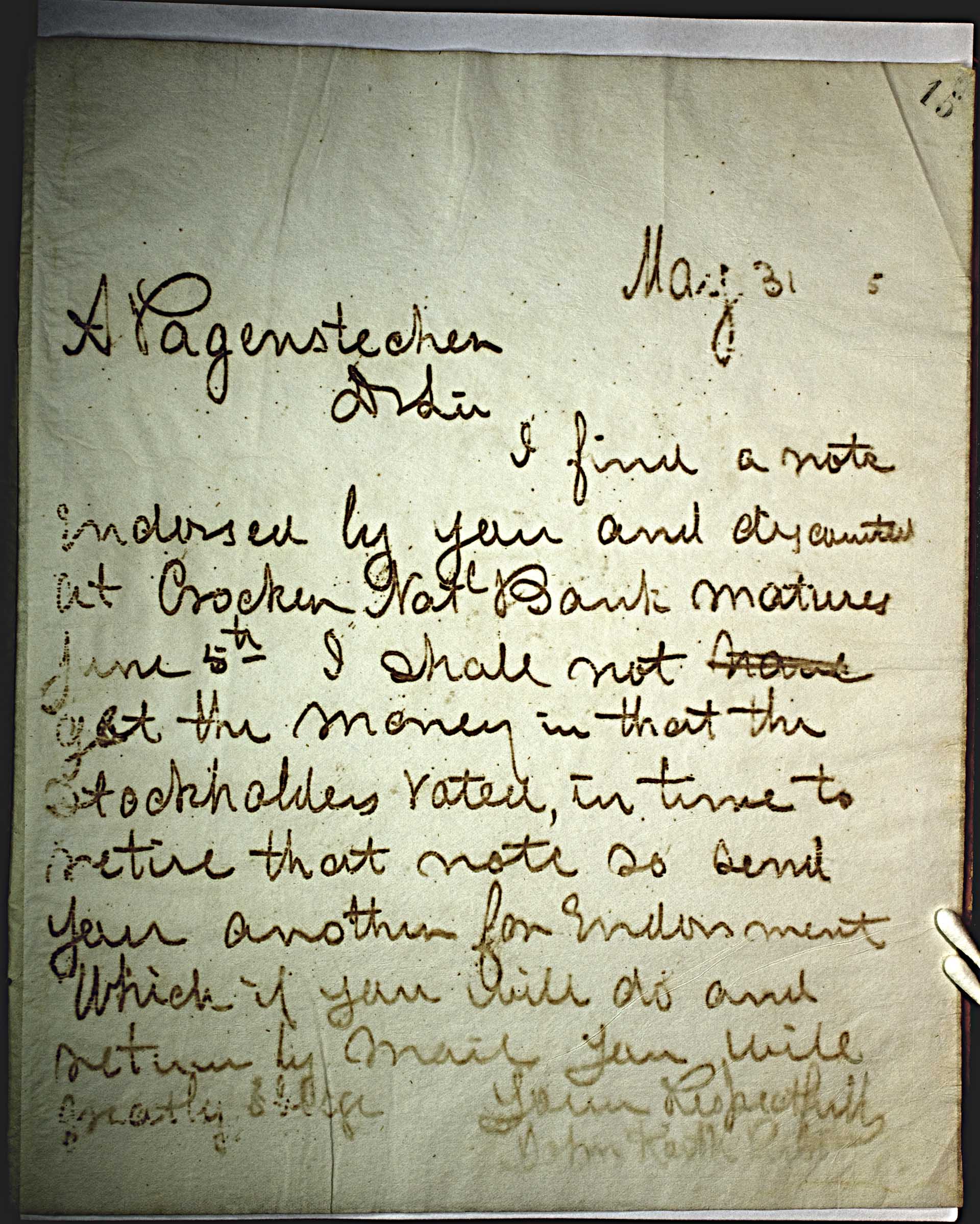 May 31, 5 (1875) -- A Pagenstecher -- Dir Sir, -- I find a note endorsed by you and discounted at Crocker Nat Bank matures June 5th . I shall not get the money in that the stockholders voted, in time to retire that note so send you another for endorsement, which if you will do and return by mail you will greatly oblige -- Yours Respectfully, -- John Keith Prest -- ; -- In 1866, Albrecht Pagenstecher, a German immigrant living in Stockbridge, Massachusetts, together with his brother Rudolf, bought two German-made Keller-Voelter grinders. On March 5, 1867, in nearby Curtisville, Pagenstecher was the first in the United States to manufacture commercially viable wood pulp. He sold the pulp to the Smith Paper Company which immediately produced commercial newsprint. However, Pagenstecher initially made his pulp out of aspen or "popple"; however, he soon exhausted his supply of this tree and was forced to substitute with less friable softwoods, with the result that the New York World cancelled its contract for newsprint.