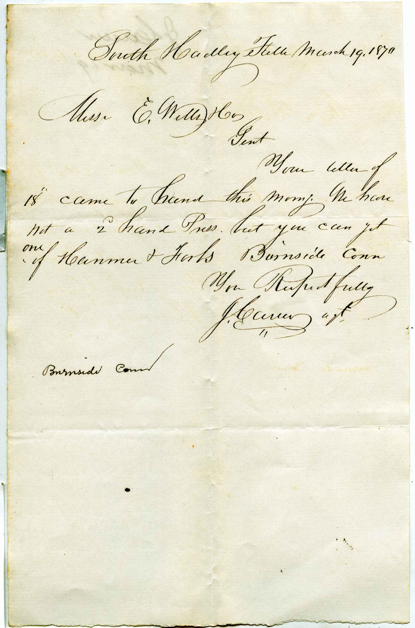 letter; Carver, J. - Selling a hand press - South Hadley Falls, Ma.