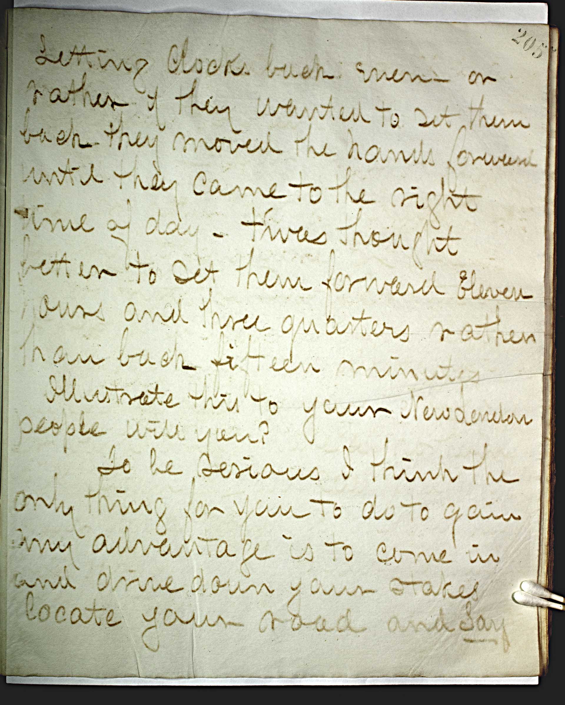 setting clocks back even or rather if they wanted to set them back they moved the hands forward until they came to the right time of day. T’was thought better to get them forward eleven hours and three quarters rather than back fifteen minutes. -- Illustrate this to your New London people will you? -- To be serious I think the only thing for you to do to gain any advantage is to come in and drive down your stakes locate your road and say --