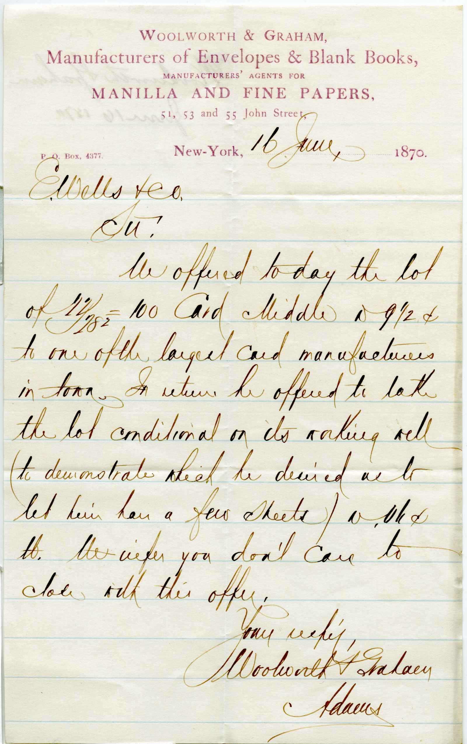 letter; Woolworth & Graham - Manufacturers of Envelopes and Blank Books - N.Y.
