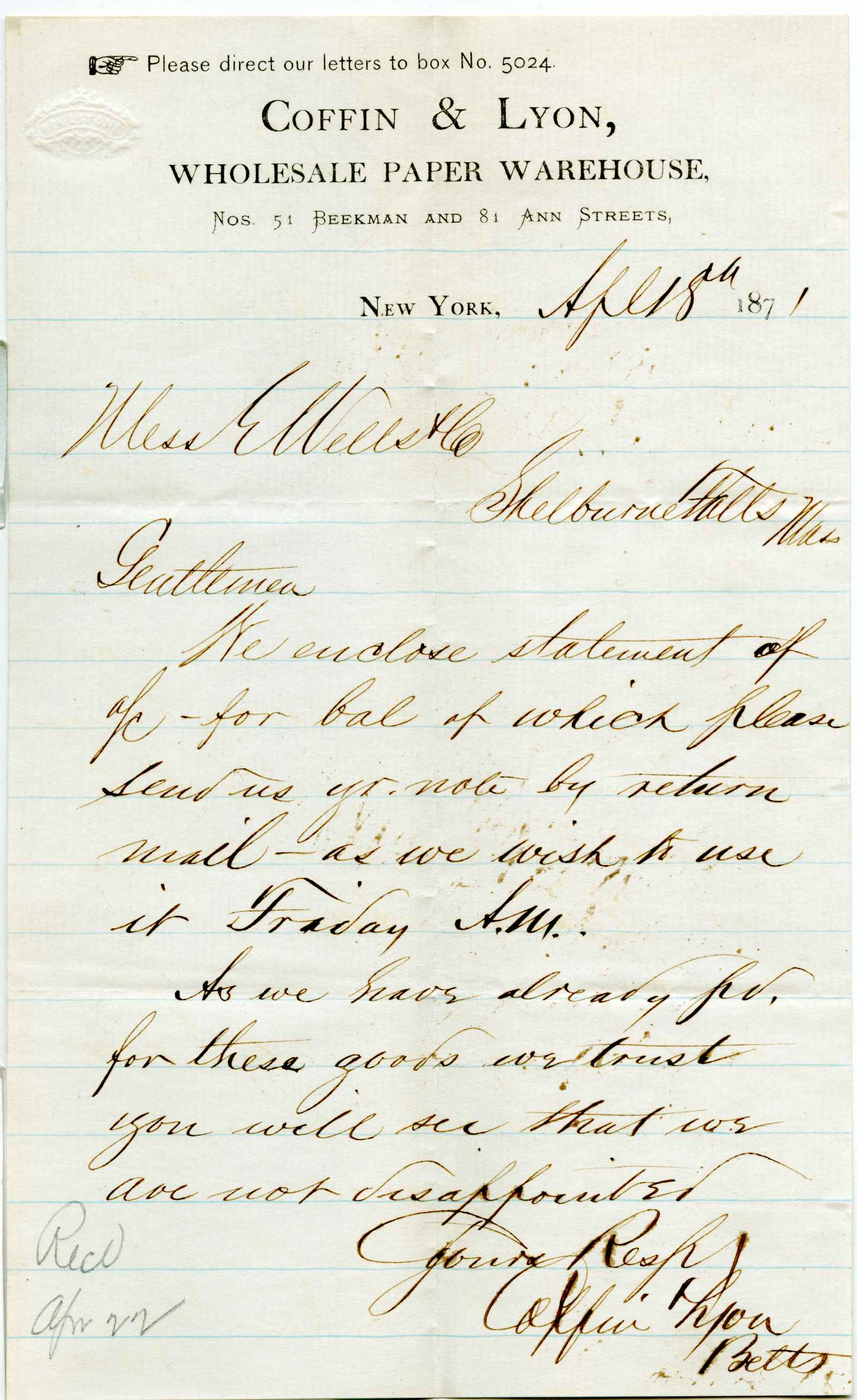 letter; Coffin & Lyon - Wholesale Paper Warehouse - N.Y.