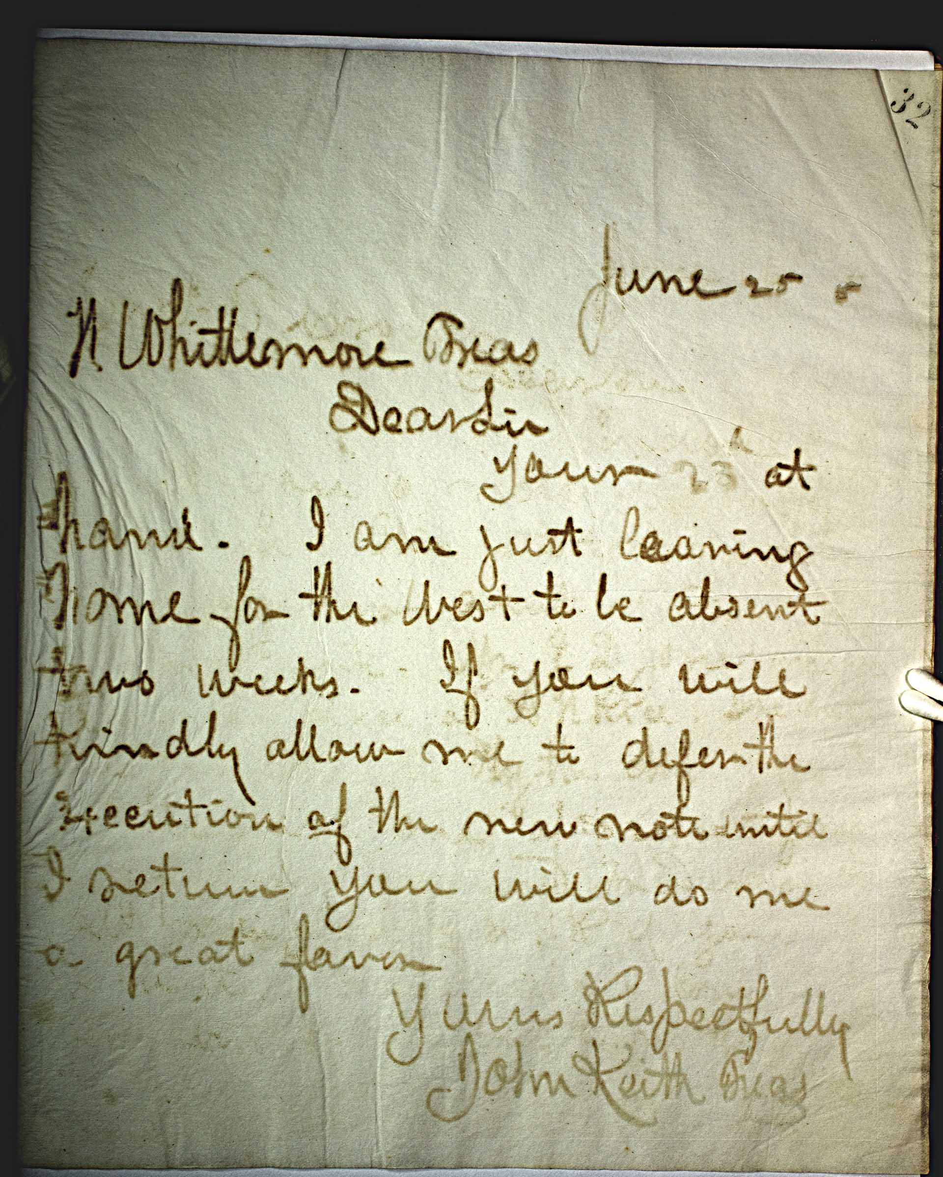 June 25 5 [1875] -- H. Whittemore Treas -- Dir Sir -- Your 23rd at hand. I am just leaving home for the west to be absent two weeks. If you will kindly allow me to defer the execution of the new note until I return you will do me a great favor. -- Yours Respectfully -- John Keith