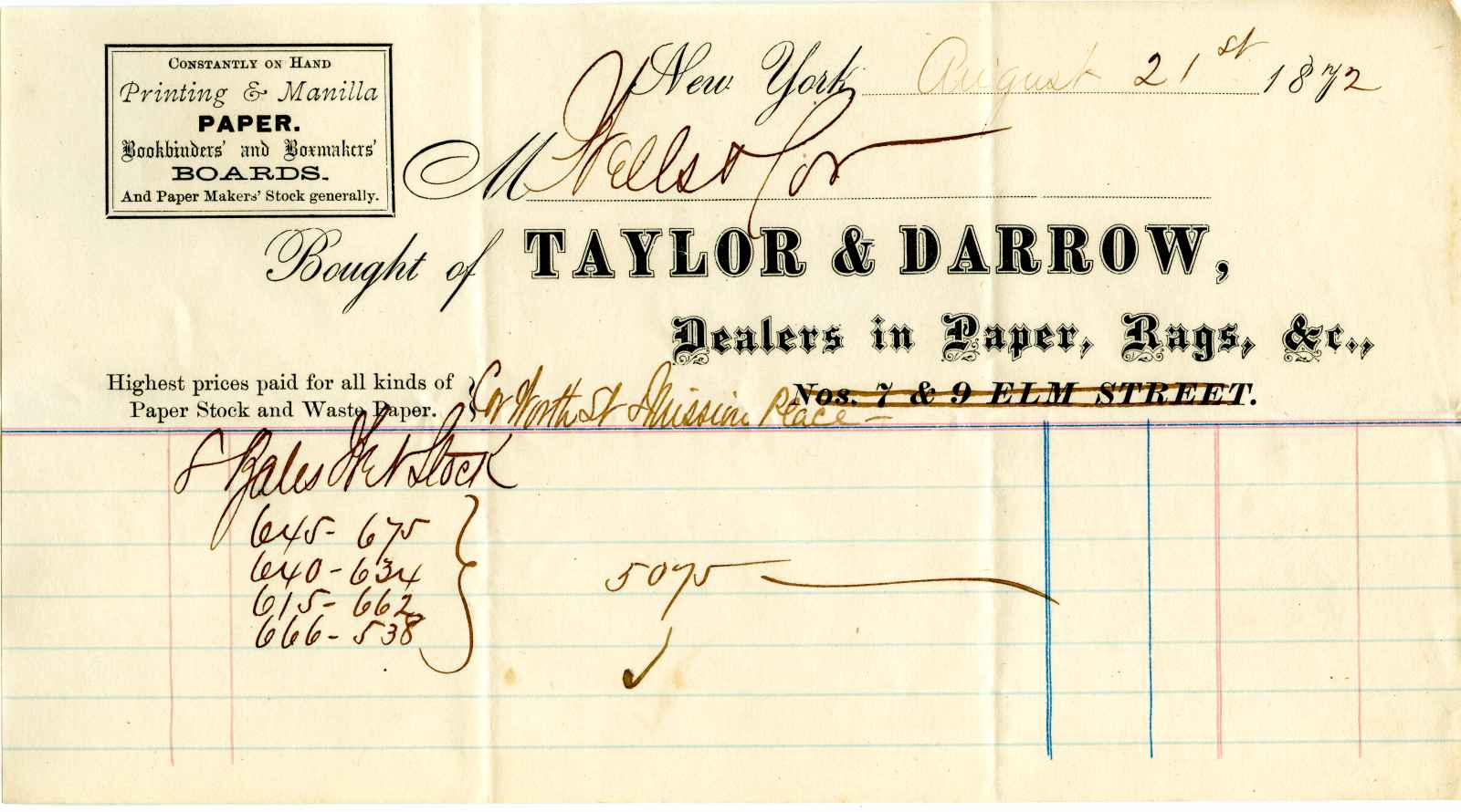 | dc.description | statement; Taylor & Darrow - Worth St.& Mission Place - N.Y. Dealers in Paper, Rags, &c. | |