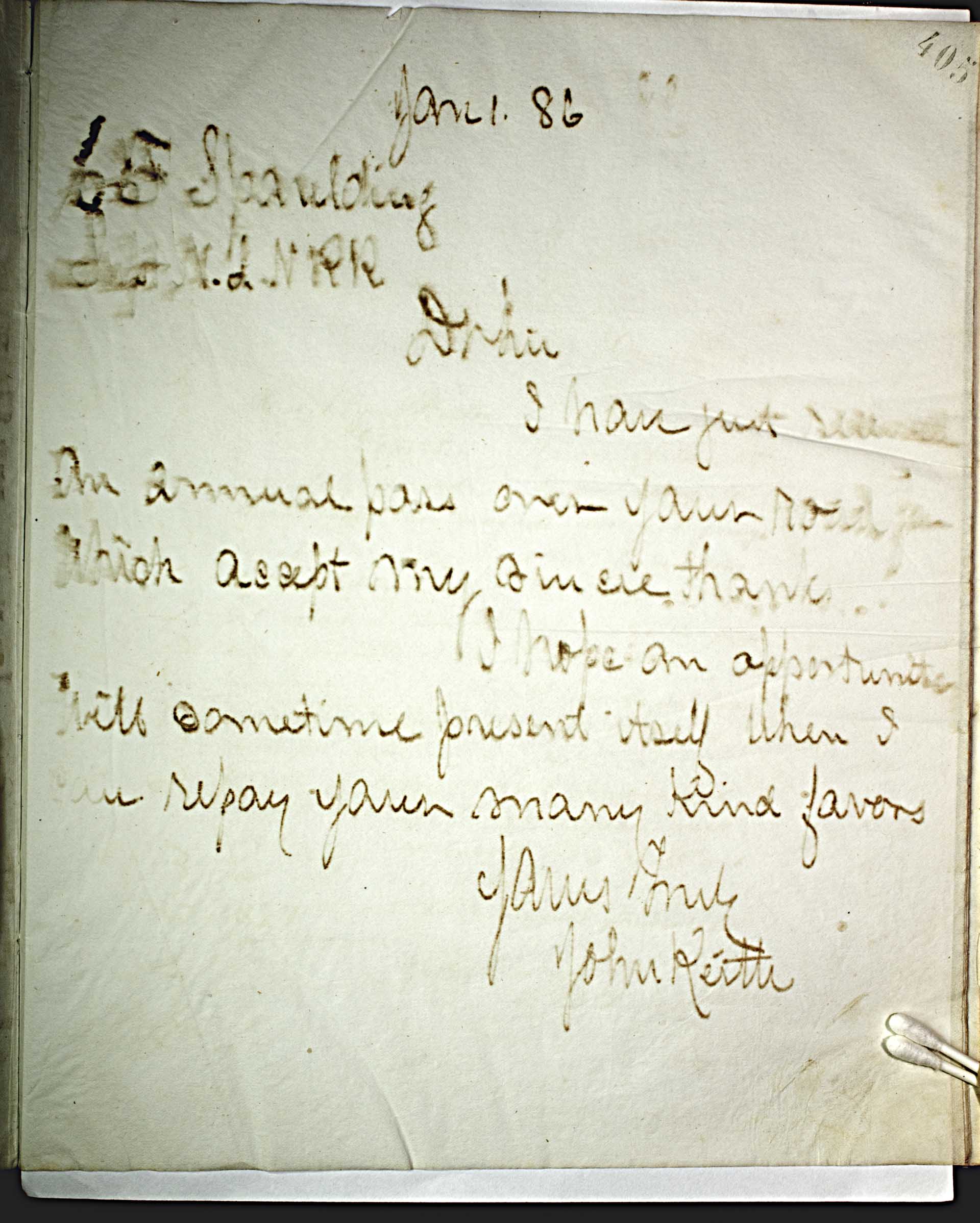 Jan. 1. 86, [1886] -- L. E. Spalding -- Supt. N.L.N. RR -- Dr Sir, -- I have just received an annual pass over your road for which accept my sincere thanks. -- I hope an opportunity will sometime present itself when I can repay your many kind favors. -- Yours Truly -- John Keith --