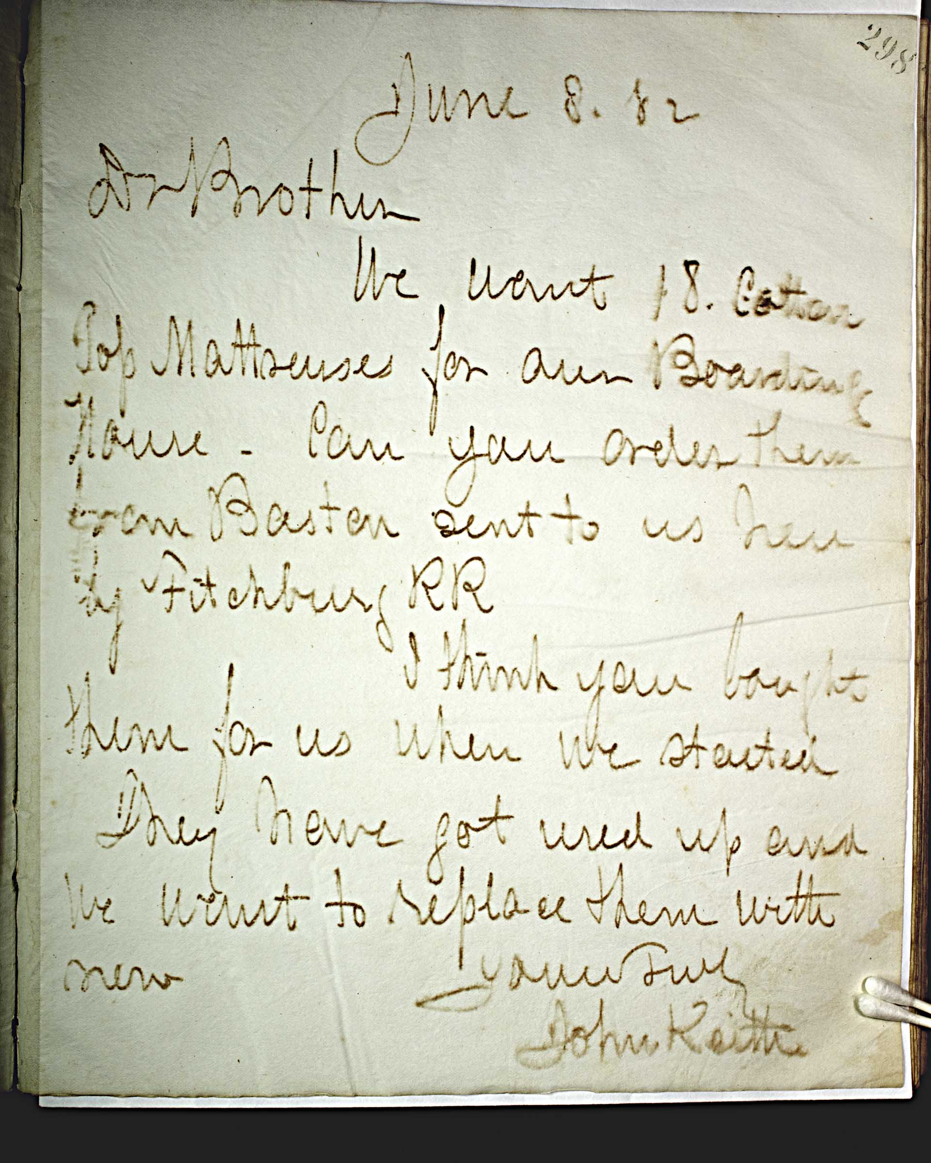 June 8, 82 [1882] -- Dr Brother, -- We want 18 cotton top mattresses for our Boarding House. Can you order them from Boston sent to us here by Fitchburg RR. -- I think you bought them for us when we started. -- They have got used up and we want to replace them with new. -- Yours Truly -- John Keith --