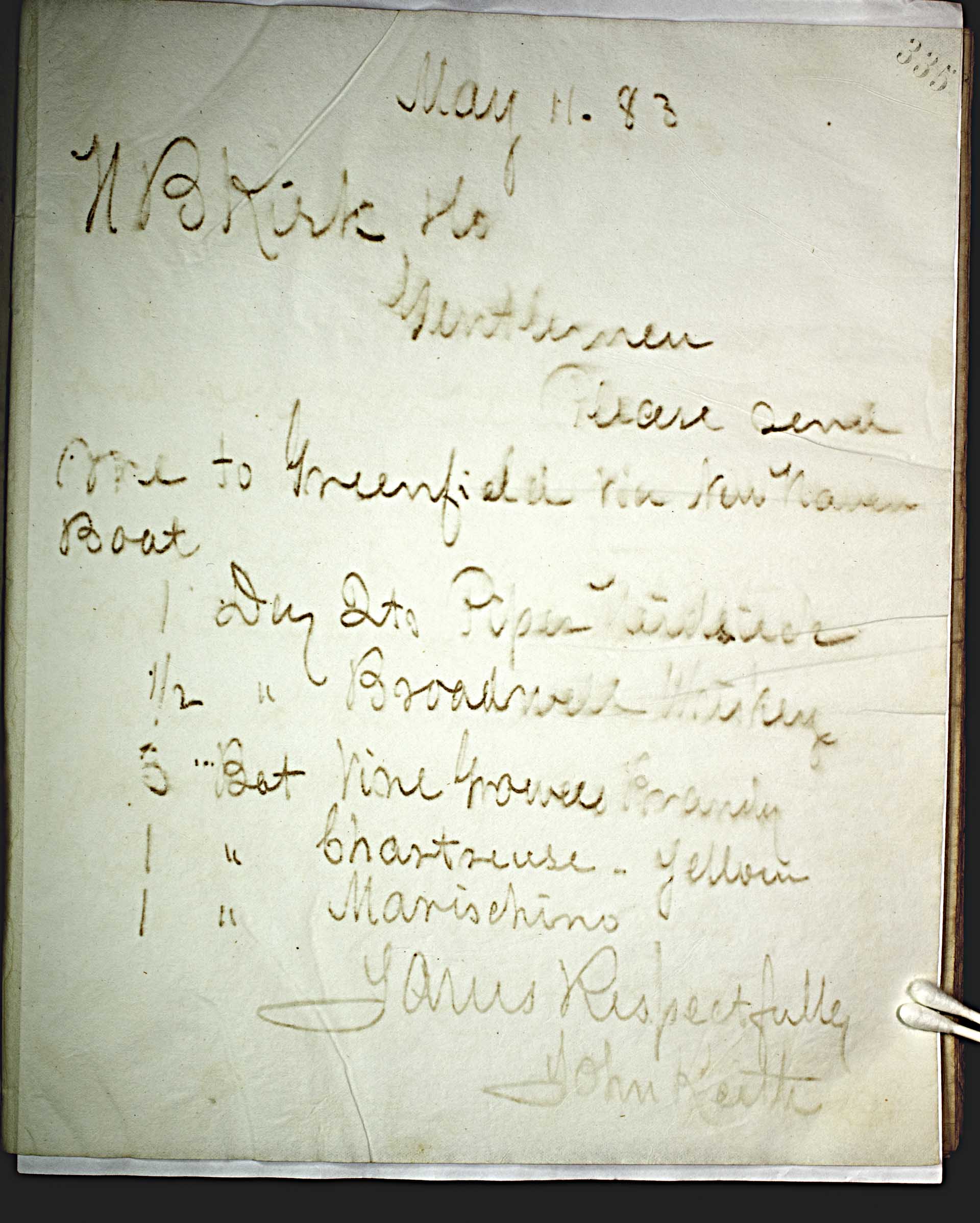 May 11, 83 [1883] -- N.B. Kirk & Co. -- Gentlemen, -- Please send me to Greenfield via New Haven Boat. -- 1 doz. qts. Piper Heiderich -- ½ “ Broadwell Whiskey -- [5] Bot Vine Grower Brandy -- 1 “ chartreuse – yellow -- 1 “ Marischino -- Yours Respectfully -- John Keith --