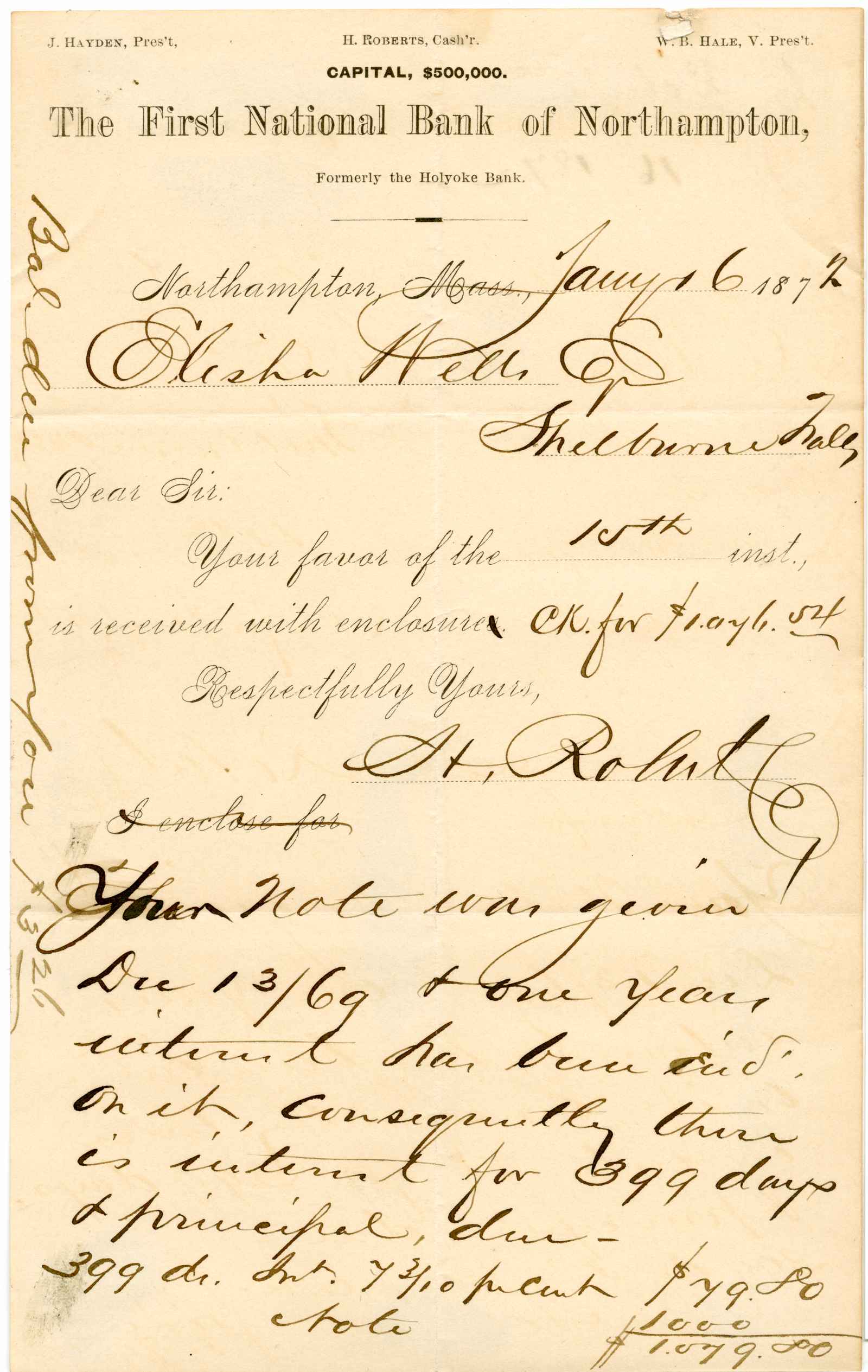 letter; First National Bank of Northampton - - Northampton, Ma.