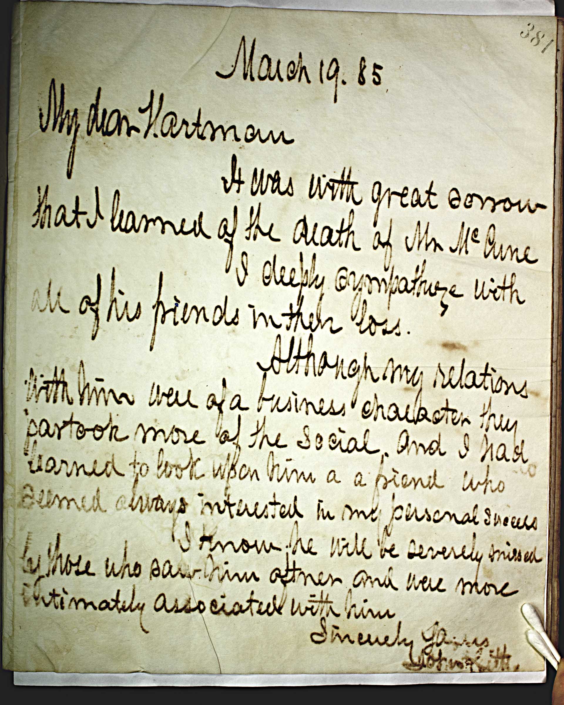 March 19, 85 [1885] -- My dear Wartman, -- It was with great sorrow that I learned of the death of Mr. McCune. -- I deeply sympathize with all of his friends in their loss. -- Although my relations with him are of a business character they partook more of the social, and I had learned to look upon him a friend who seemed always interested in my personal success. -- I know he will be severely missed by those who saw him often and were more intimately associated with him. -- Sincerely yours -- John Keith -- --