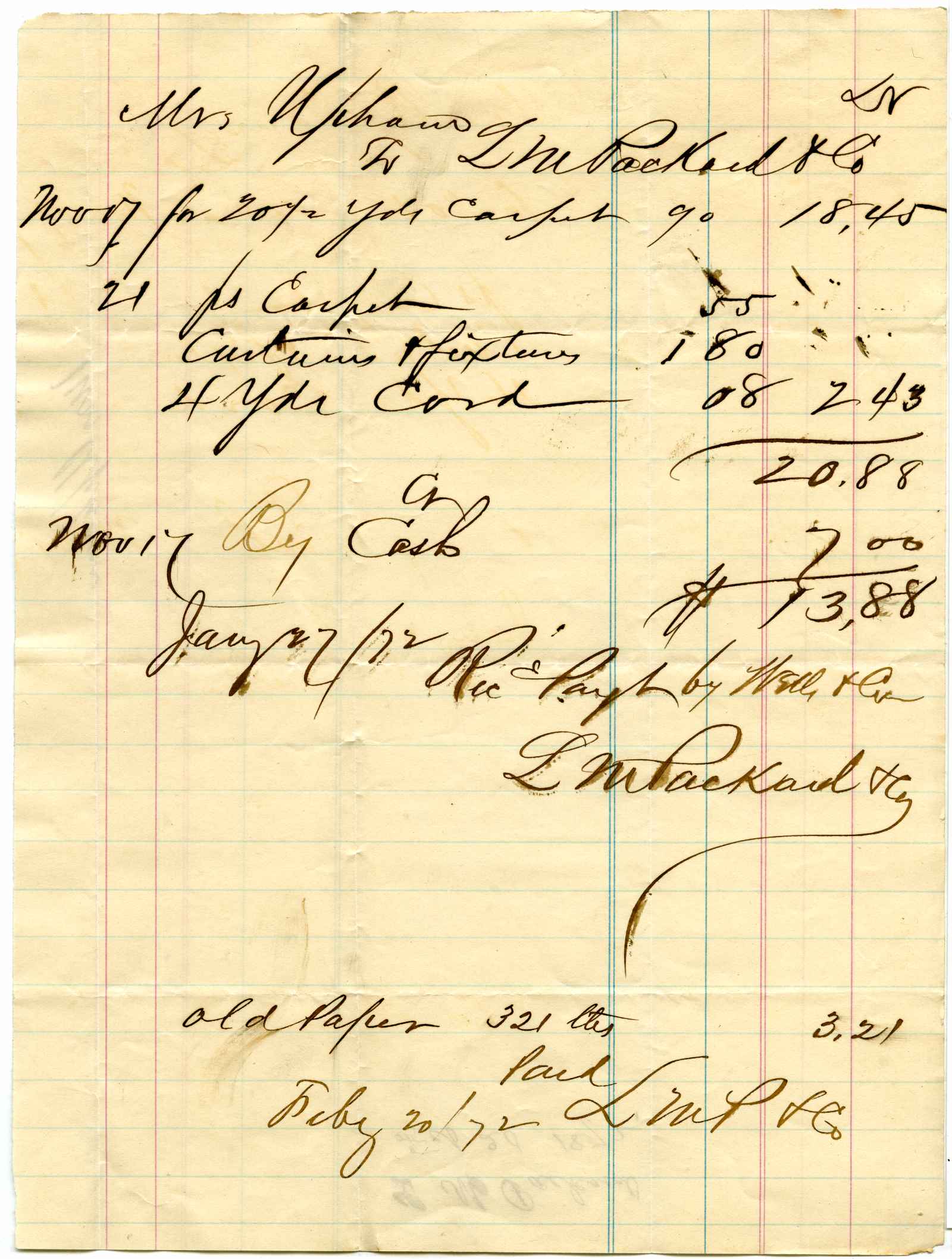 receipt; Packard, L. M. (Mrs. Upham) - Billing for curtains, &c. - ?