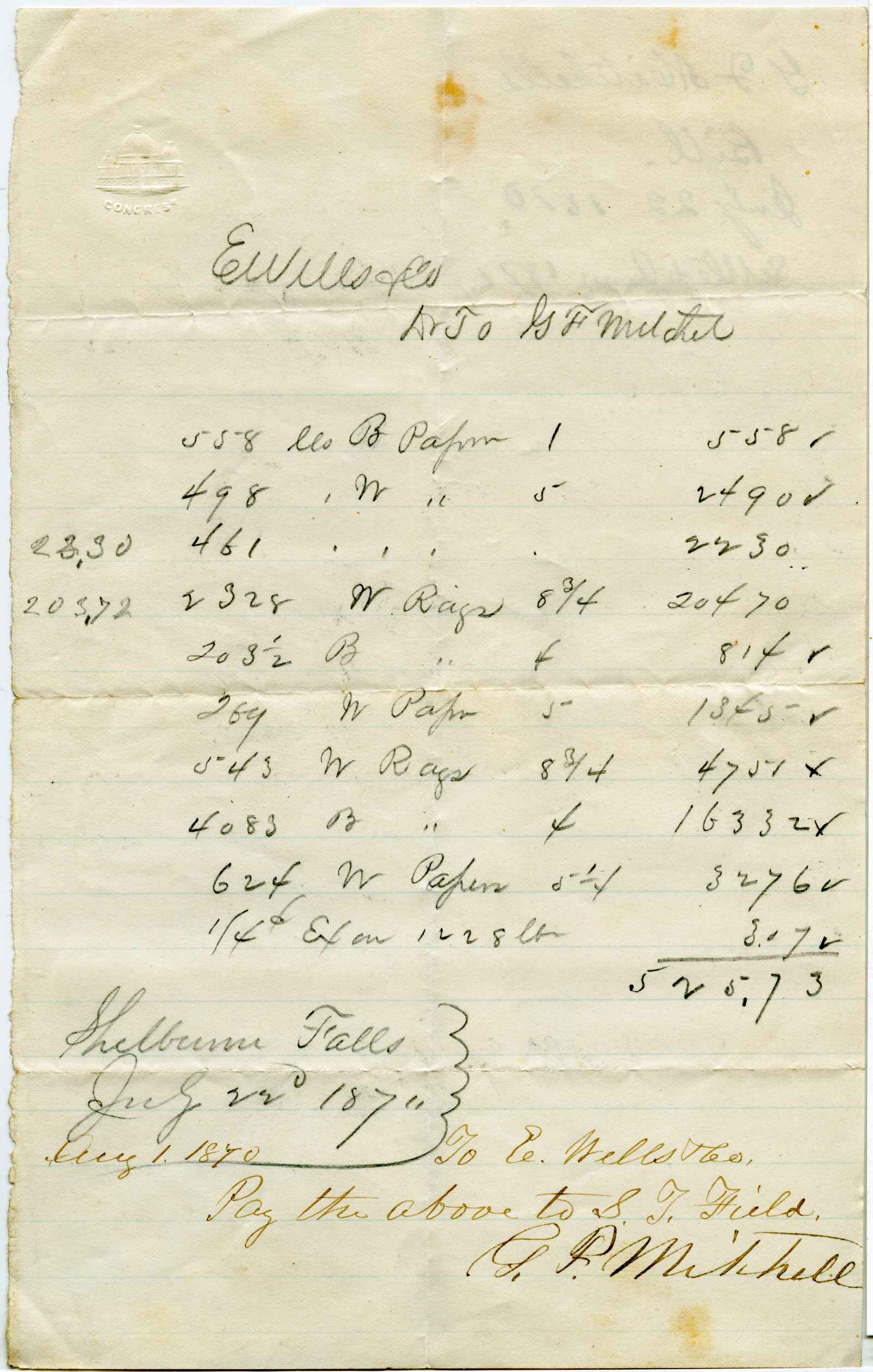 incoming correspondence to the papermaking company of Elisha Wells - circa 1870
