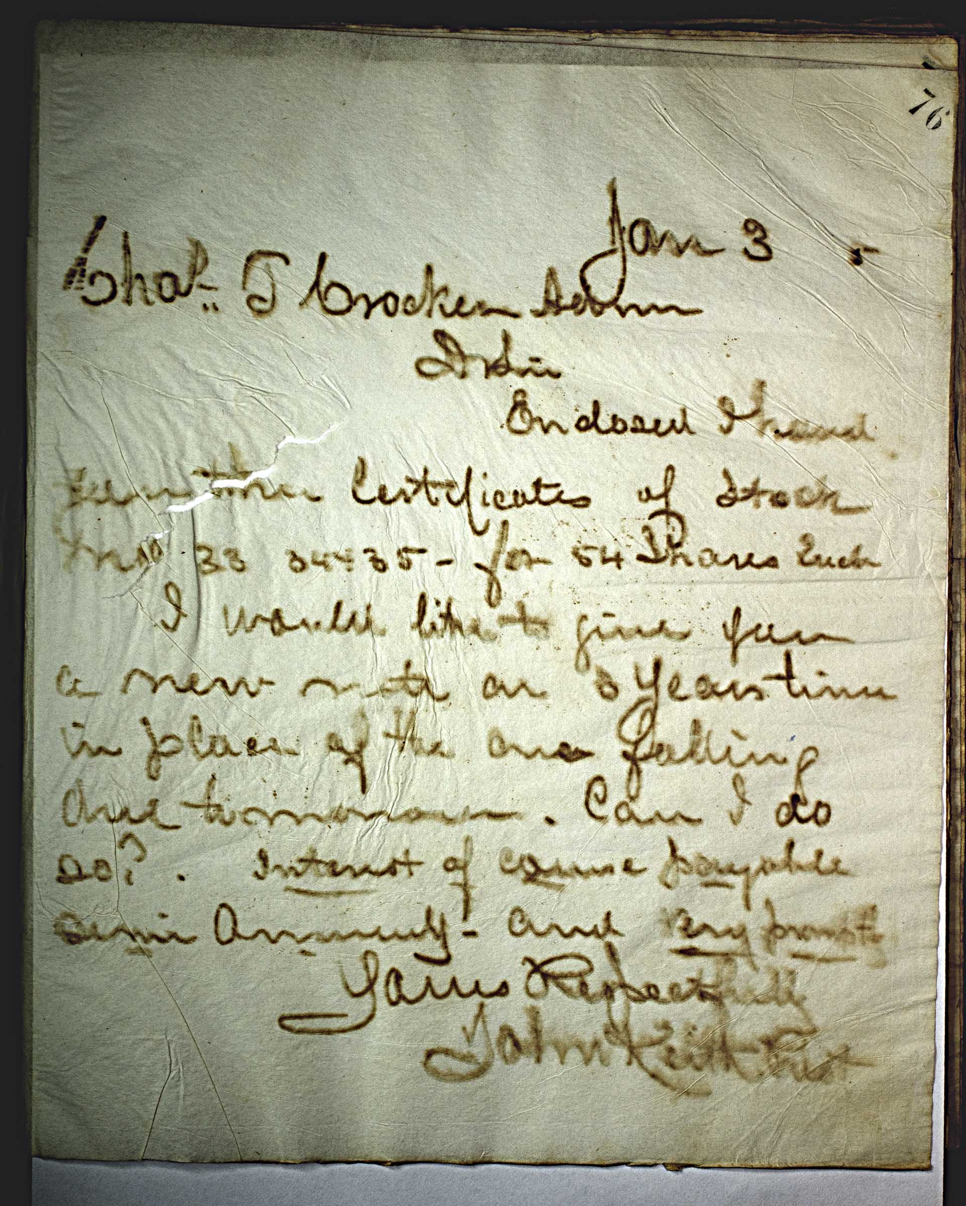 Jan 3 5 [1875] -- Chas. T. Crocker -- Dr Sir, -- Enclosed I hand you three Certificates of stock no -- s -- 33 34 & 35 – for 54 shares each -- I would like to give you a new note on a years time in placeof the ones falling due tomorrow. Can I do so?. Interest of cou rse p ay able s em i a nn ually – and very promptly. -- Yours Respectfully -- John Keith -- --