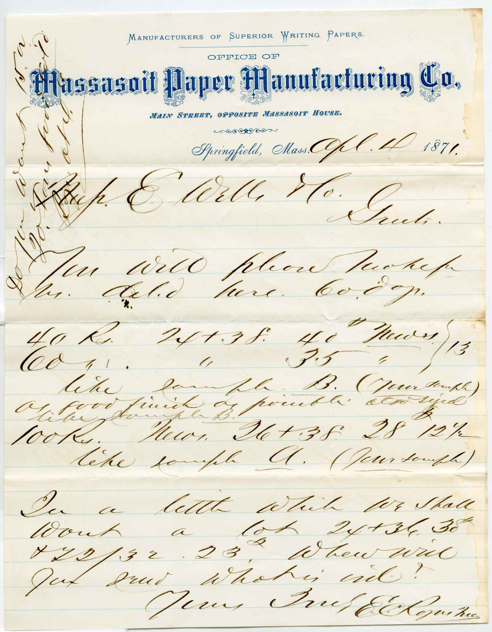 letter; Massasoit Paper Manufacturing Co. - Order for paper - Springfield, Ma.