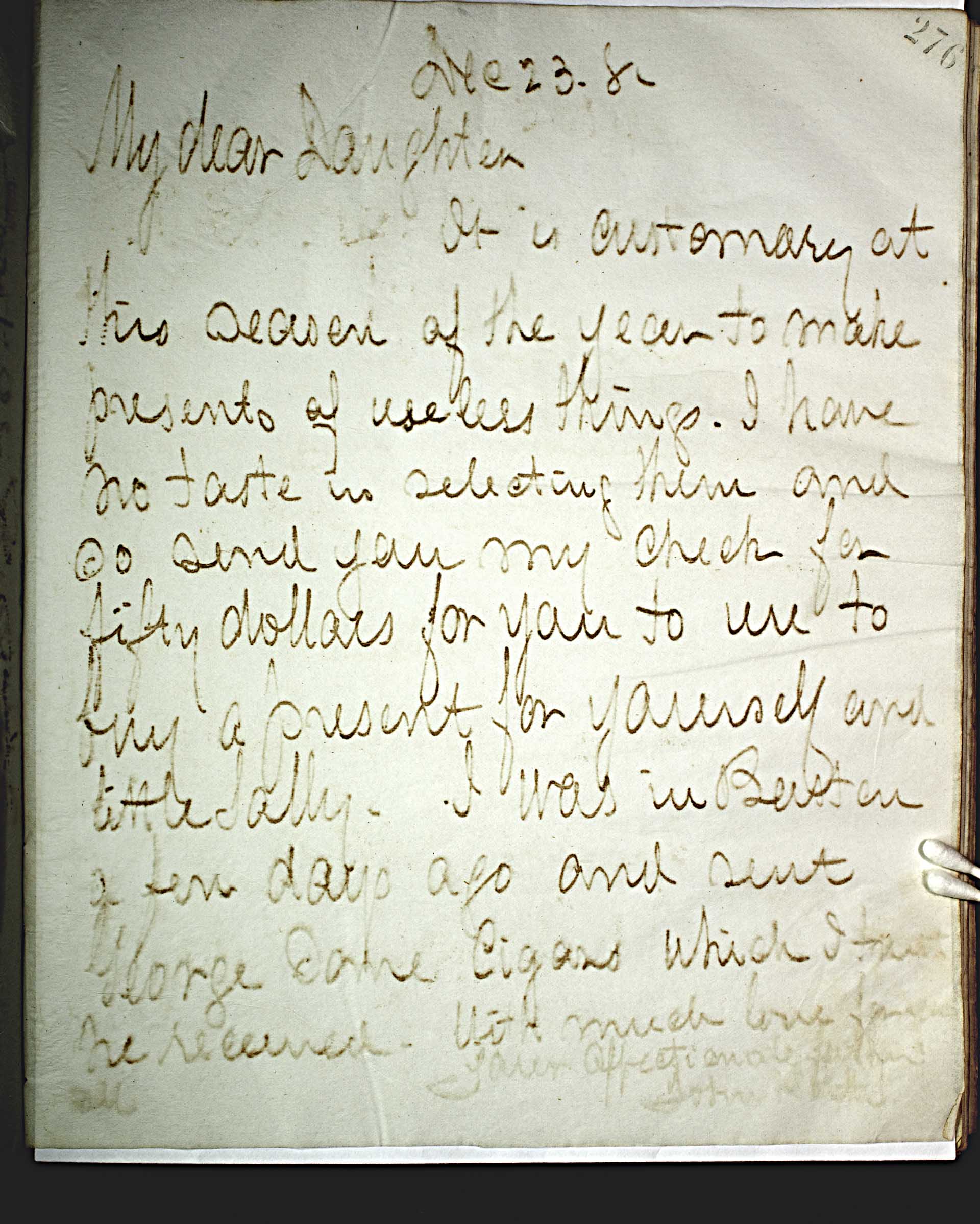 Dec 23, 81 [1881] -- My dear Daughter, -- It is customary at this season of the year to make presents of useless things. I have no taste in selecting them and so send you my check for fifty dollars for you to use to buy a present for yourself and little Sally. I was in Boston a few days ago and sent George some cigars which I trust he received. -- With much love for you your affectionate father, -- John Keith --
