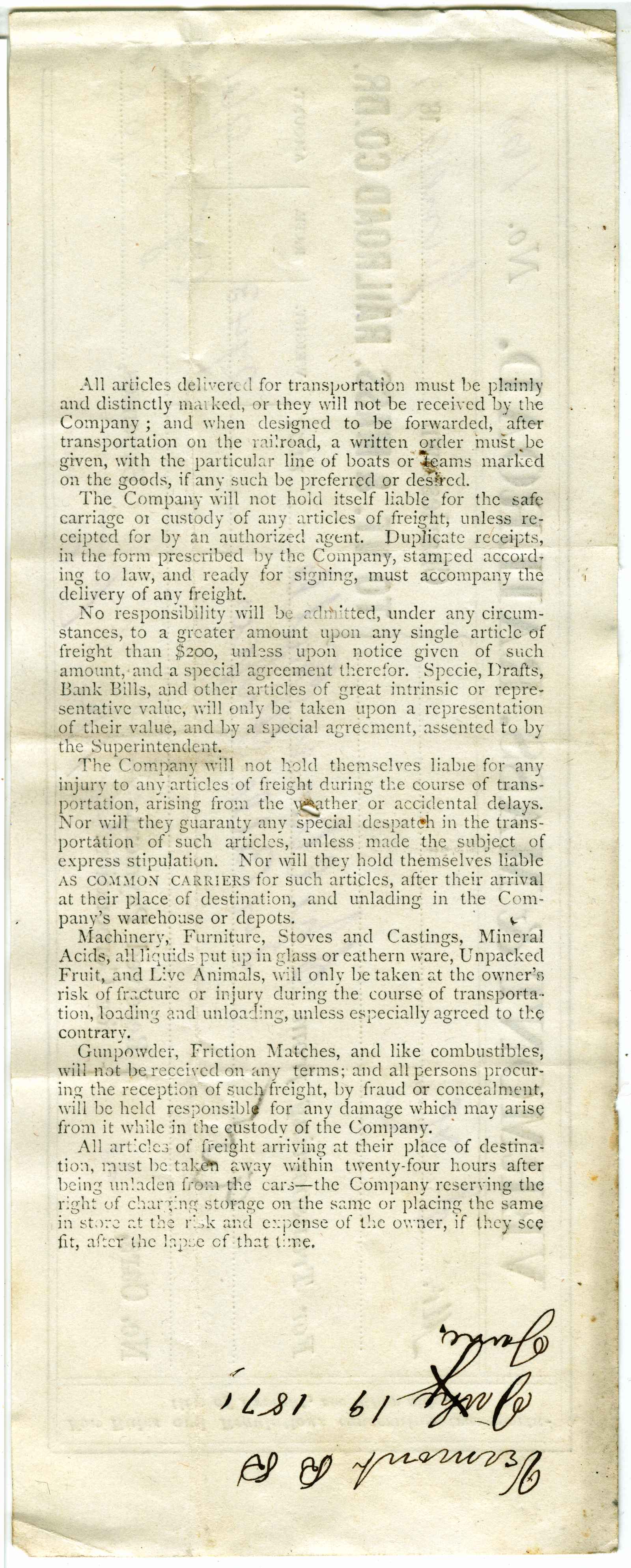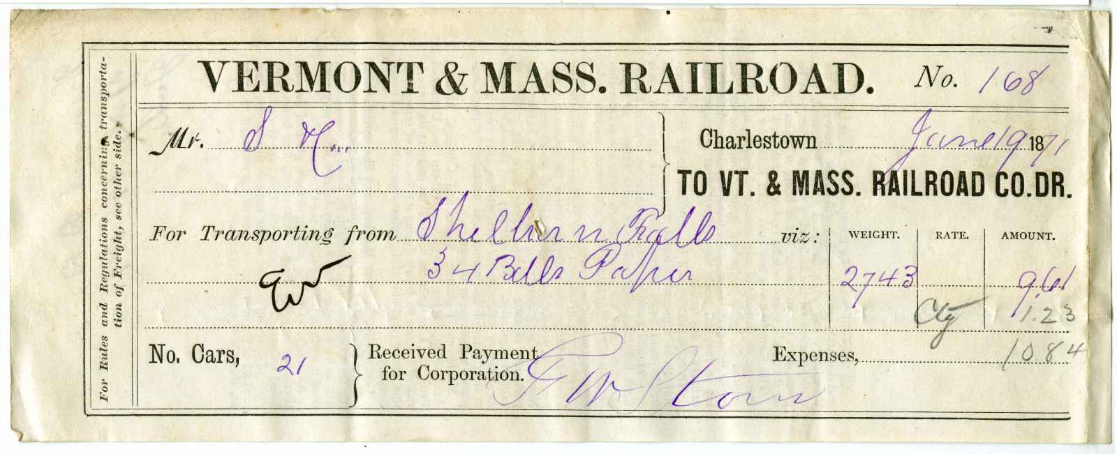 receipt; Vermont & Massachusetts Railroad Company - Greenfield office