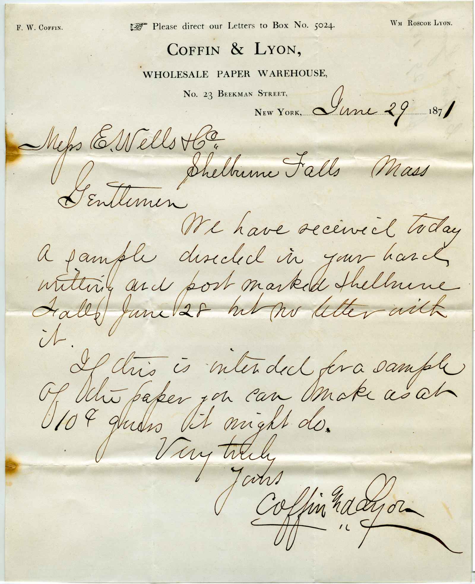 letter; Coffin & Lyon - Wholesale Paper Warehouse - N.Y.