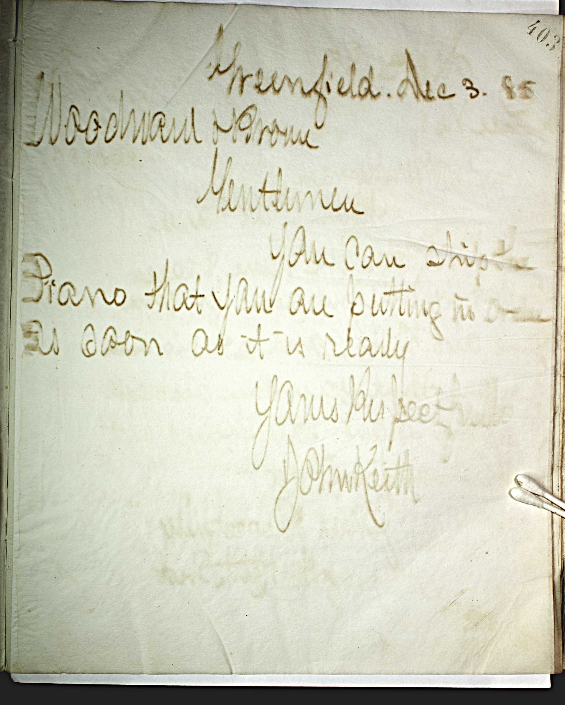Greenfield, Dec. 3, 85 [1885] -- Woodward & Brown -- Gentlemen, -- You can ship the piano that you are putting in order as soon as it is ready. -- Yours Respectfully -- John Keith --