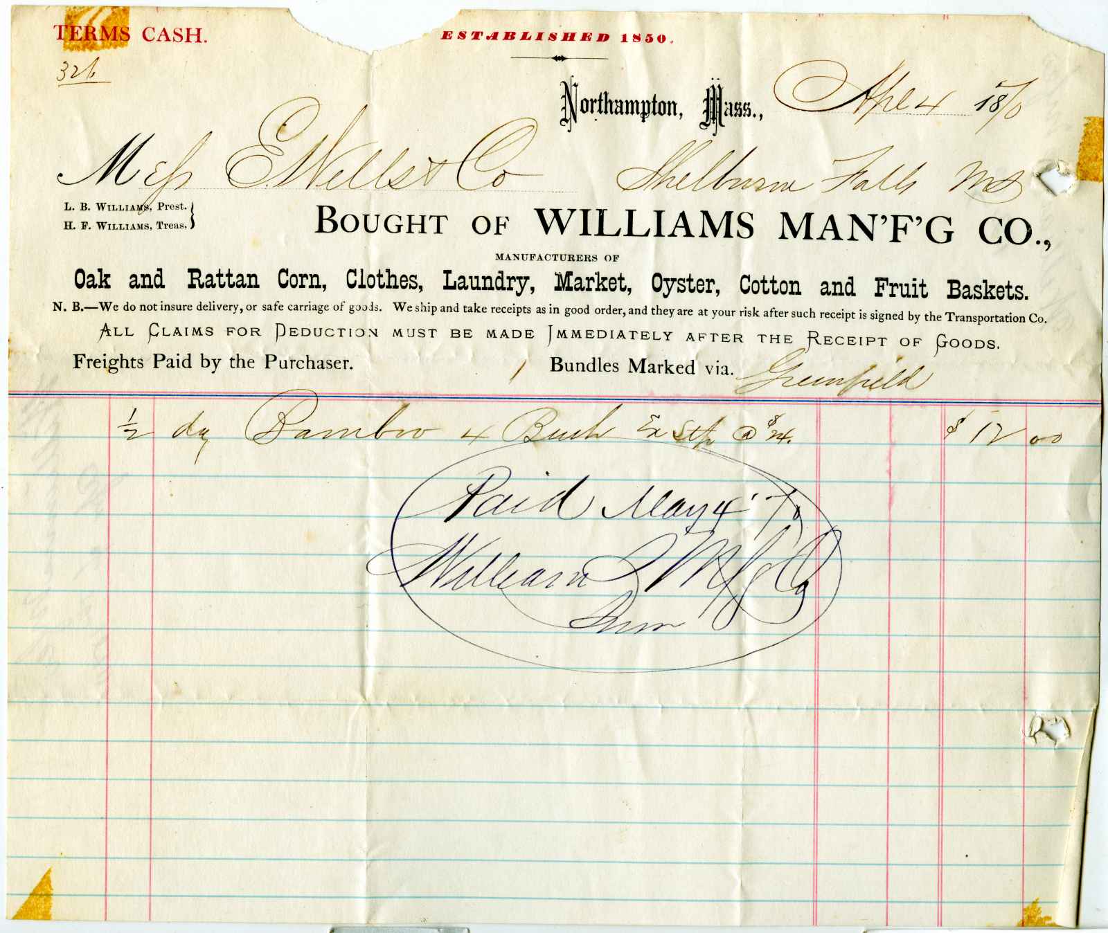 receipt; Williams Manufacturing Co. - Oak & Rattan baskets - Northampton, Ma