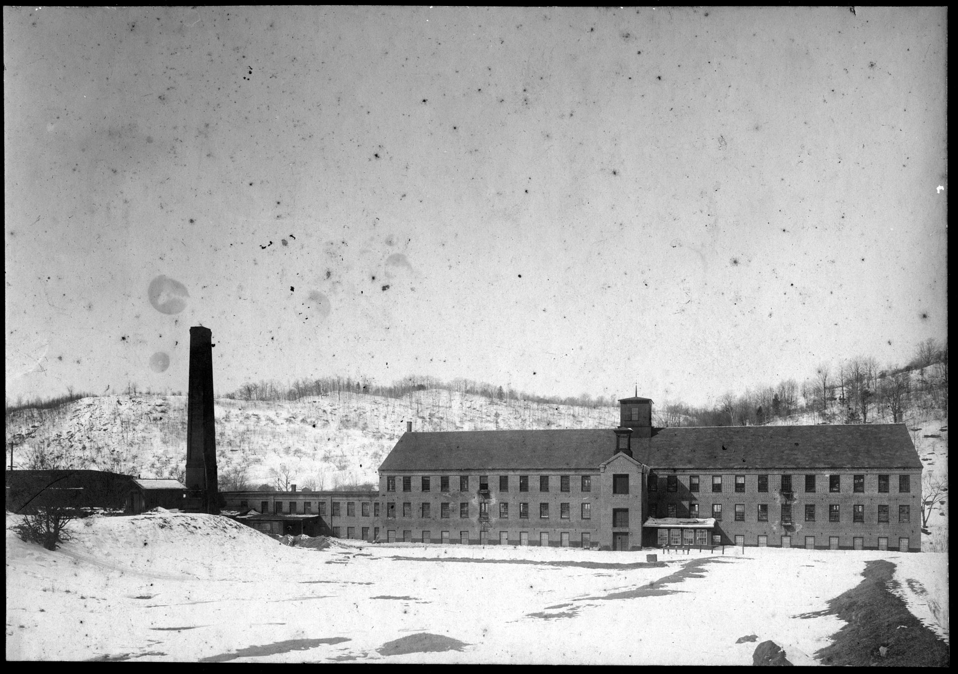(on back) Lyonsville Mill or Willis Place; - "A. Smith, who has charge of the Griswoldville Manufacturing Company's saw mill on the old Willis Place has sawed since the first of January 400,000 feet of lumber. The largest amount sawed any one day was 11,126 feet. The greatest days work was sawed into inch and a quarter boards. The work was all done with one saw and three hands. The number of logs required to make the day's work was 88. The saw was run eleven hours." (May 6, 1867).- In July of the same year it was reported that the mill would start the first of next January, and that the tenement block was under construction. Actually, the looms got onto production shortly before the end of the year."
