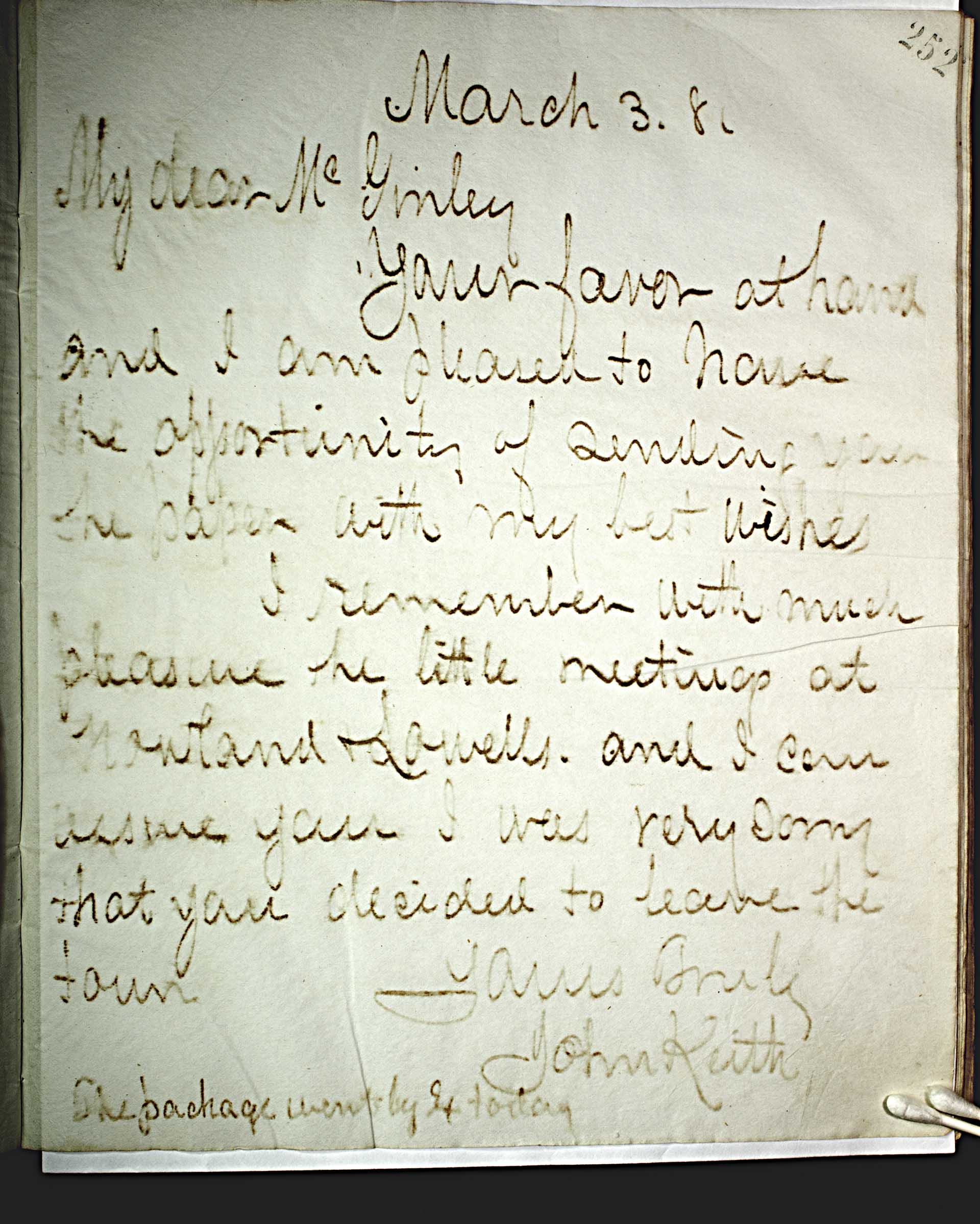 March 3, 81 [1881] -- My dear M -- c -- Ginley, -- Your favor at hand and I am pleased to have the opportunity of sending you the paper with my best wishes. -- I remember with much pleasure the little meetings at Howland & Lowells and I can assure you I was very sorry that you decided to leave the town. -- Yours Truly -- John Keith -- The package went by Ex today --