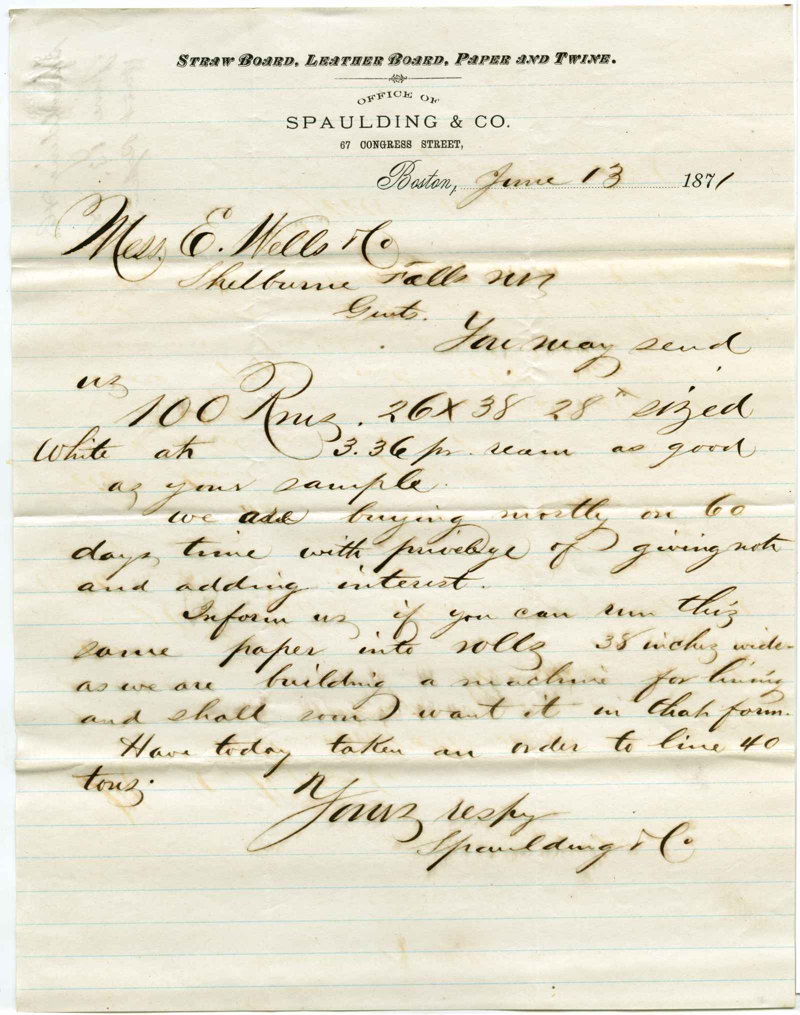 letter; Spaulding & Co. - Straw Board, Leather Board, Paper & Twine - Boston