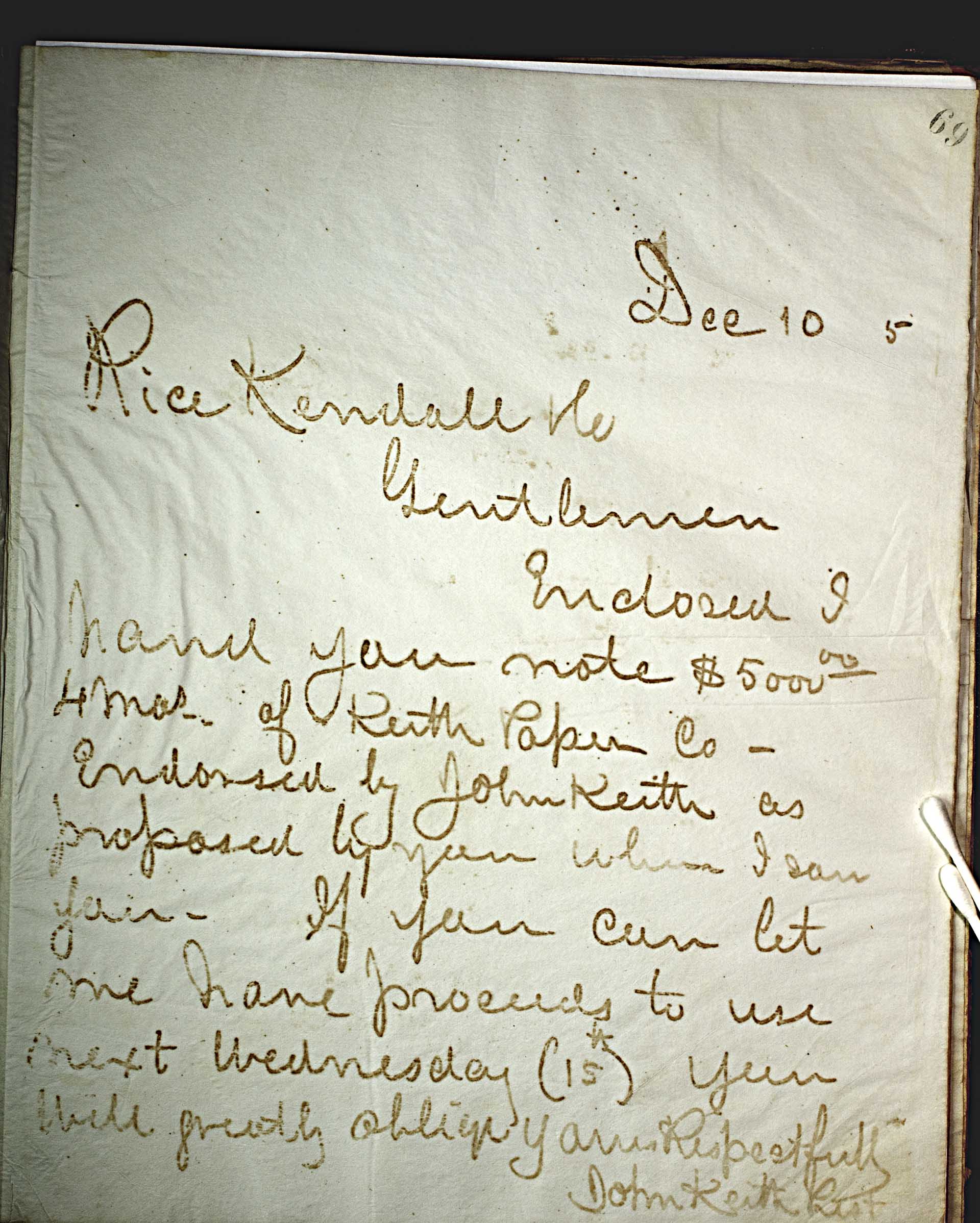 Dec. 10 5 [1875] -- Rice Kendall Co. -- Gentlemen, -- Enclosed I hand you note $5000.00 -- 4 mos of Keith Paper Co. -- Endorsed by John Keith as proposed by you when I saw you. If you can let me have proceeds to use next Wednesday (15th ) you will greatly oblige.      Yours Respectfully     John Keith Prest --