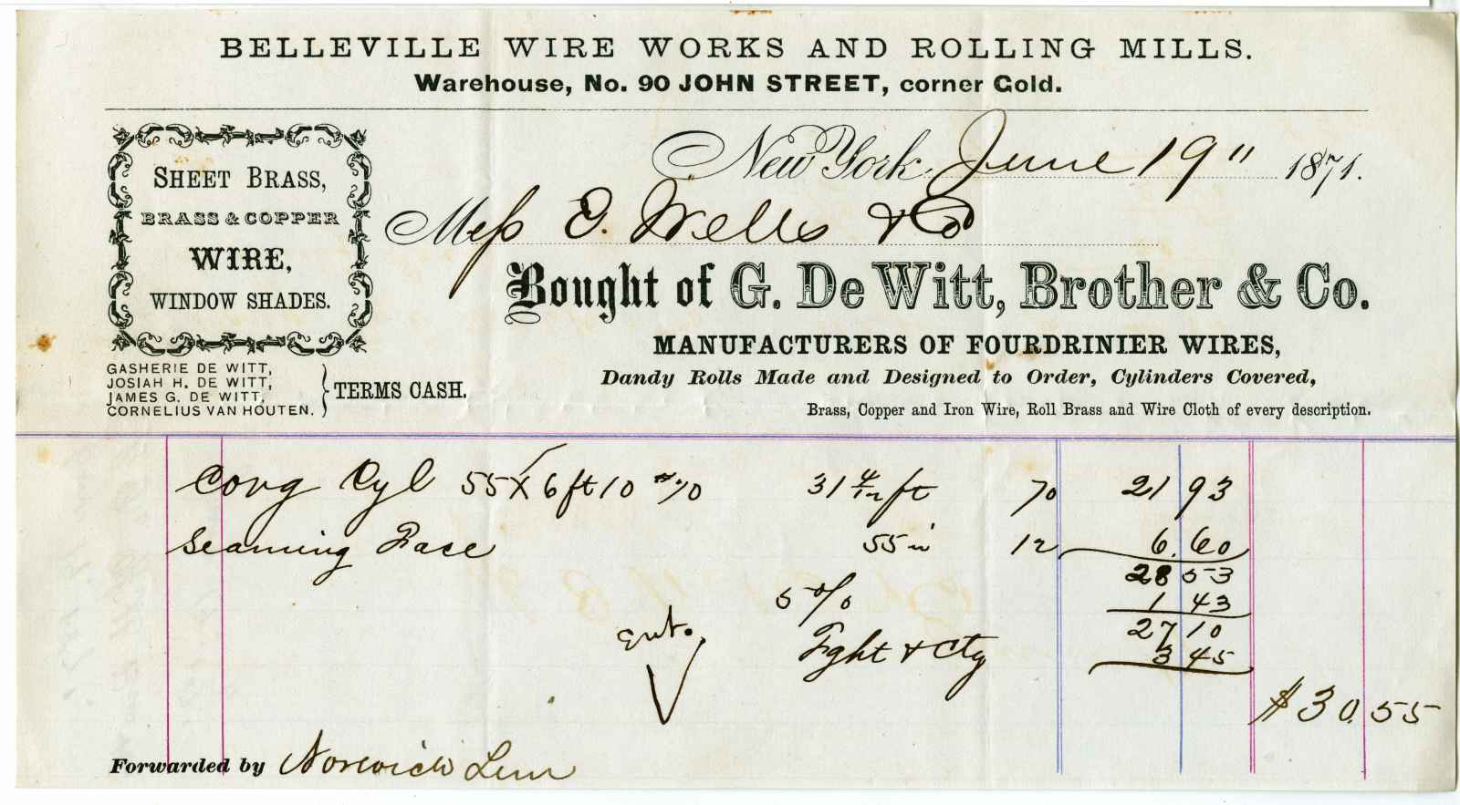 receipt; DeWitt, G., Brother & Co. - Manufacturers of Fourdrinier Wires - N.Y.