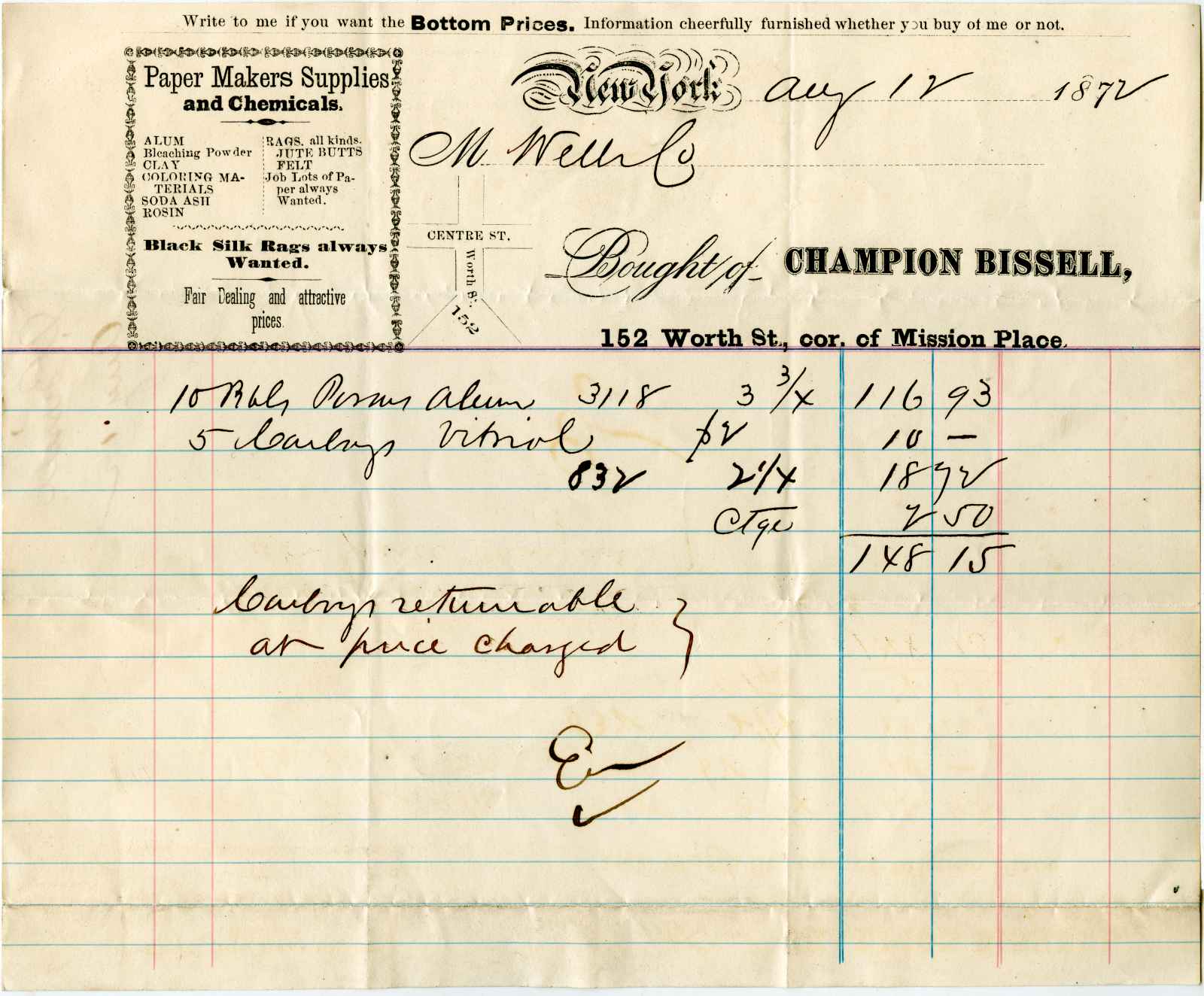 invoice; Bissell, Champion - Paper Maker Supplies and Chemicals 152 Worth St. N.Y.