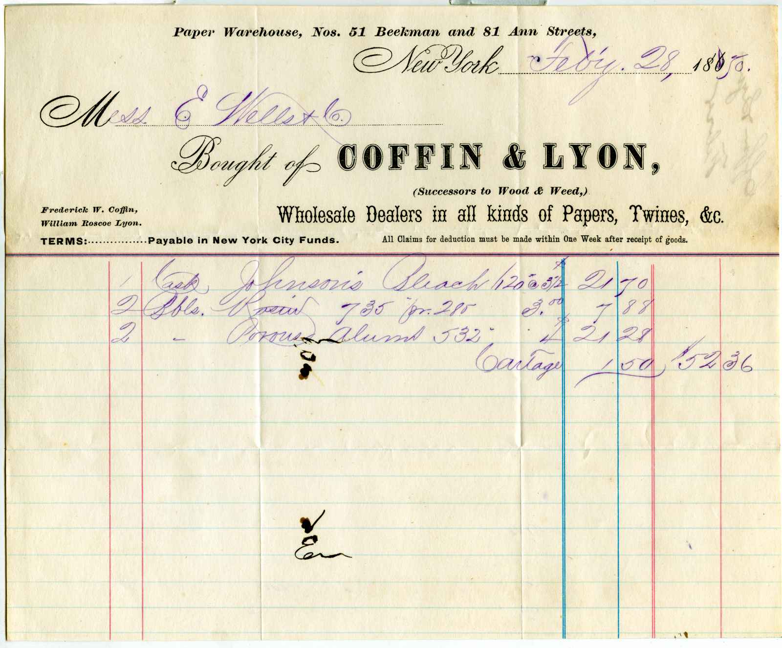 invoice; Coffin & Lyon - Wholesale Paper Warehouse - N. Y.