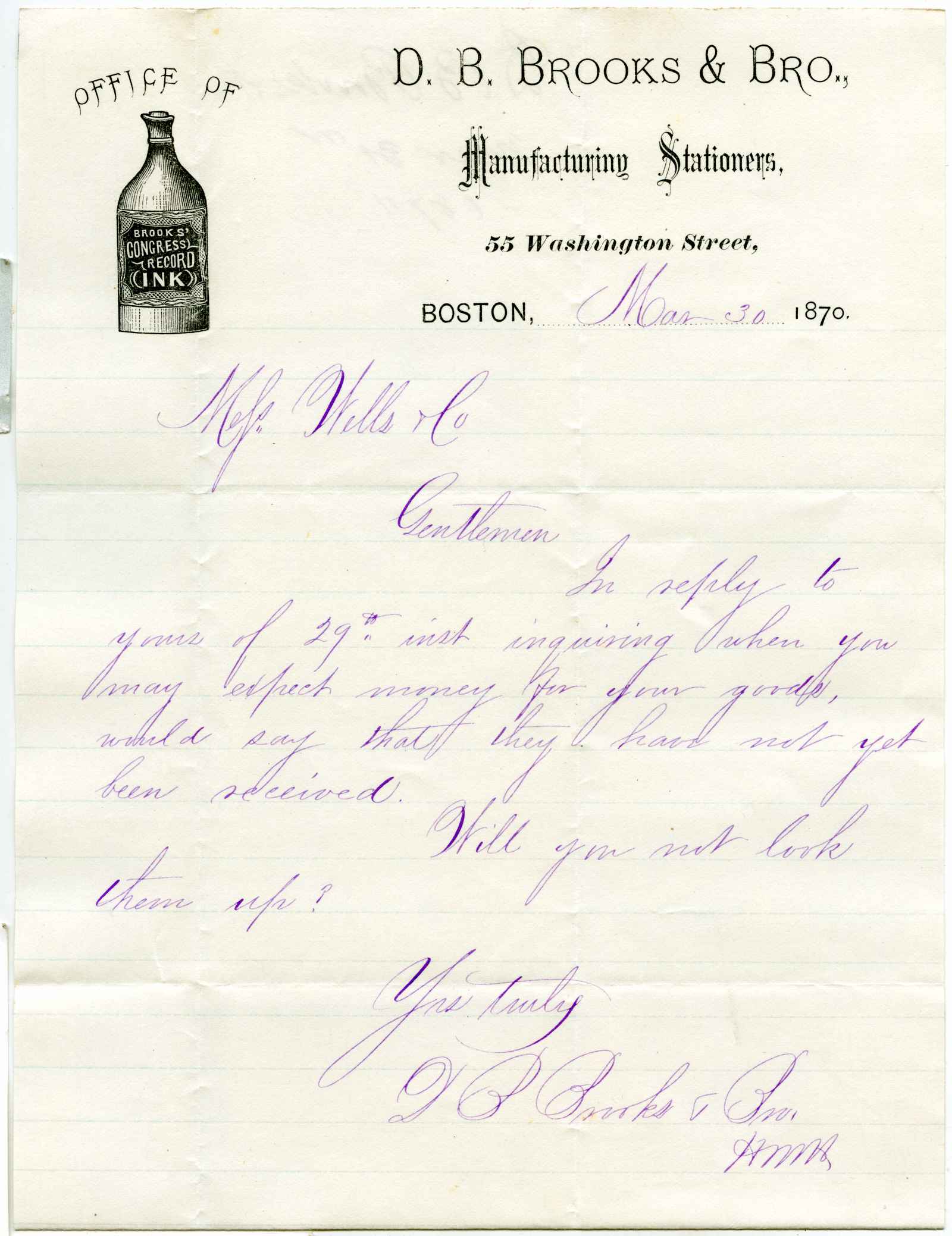 letter; Brooks, D. B. & Bro. - Manufacturing Stationers - Boston